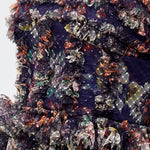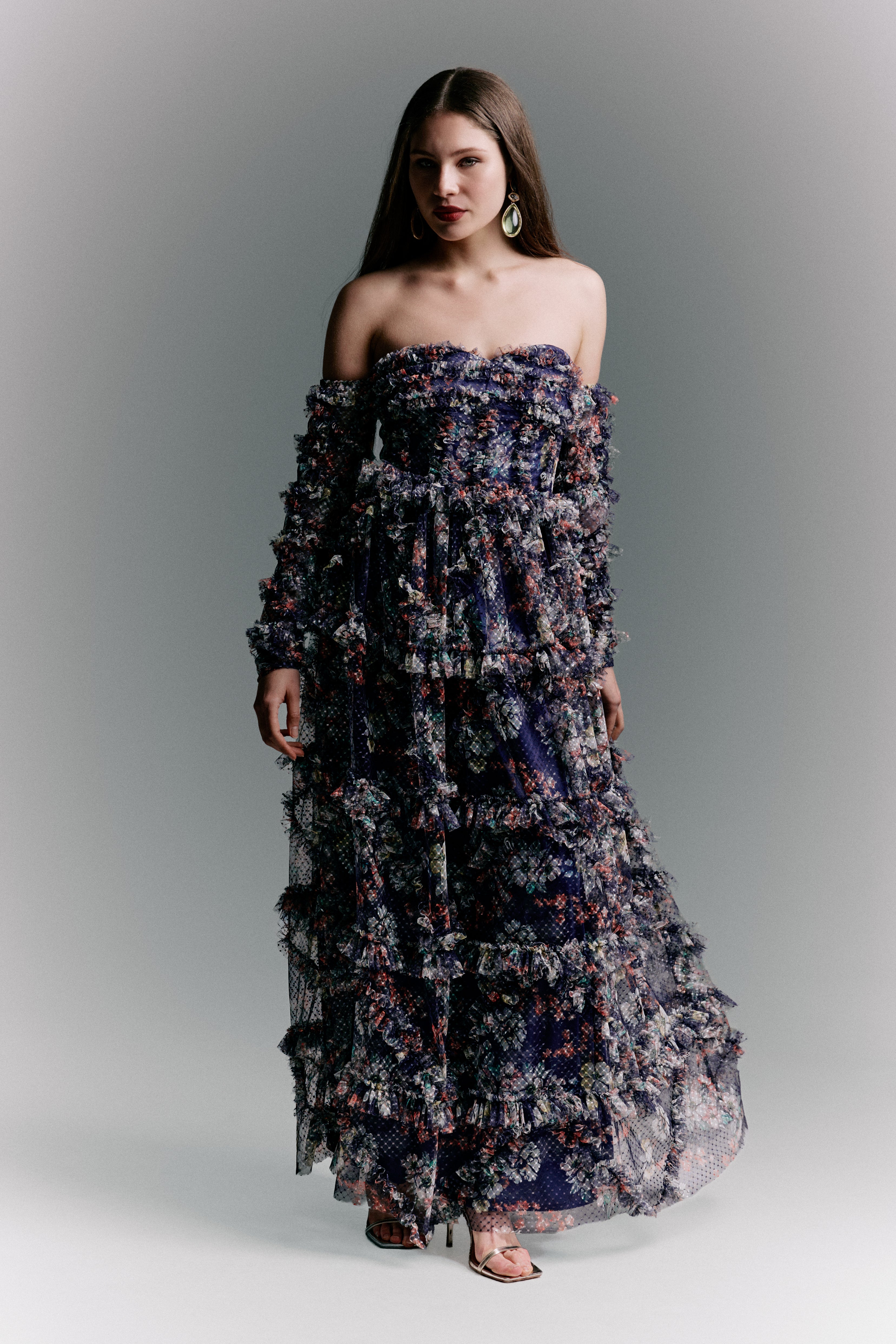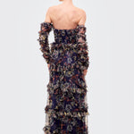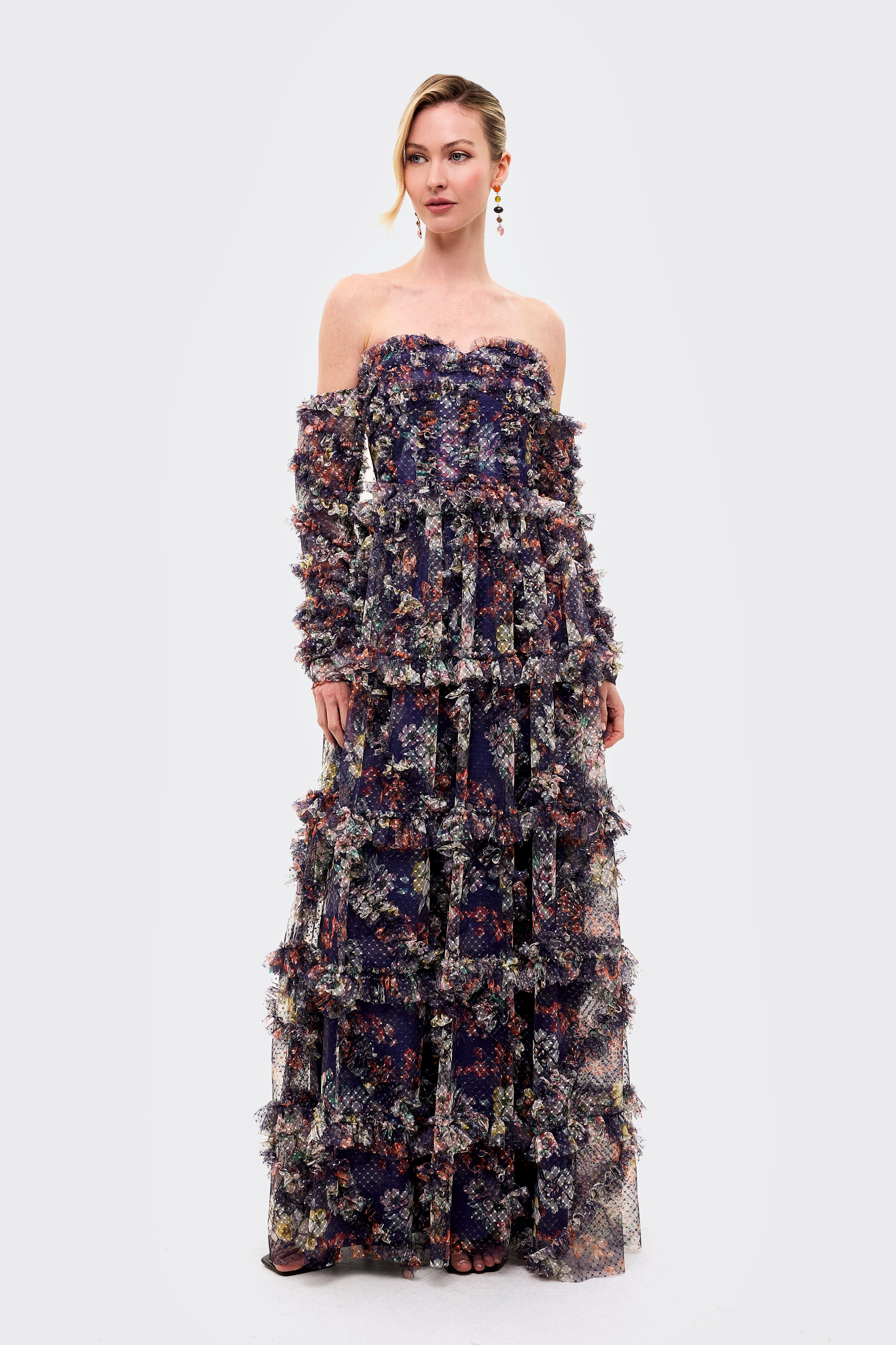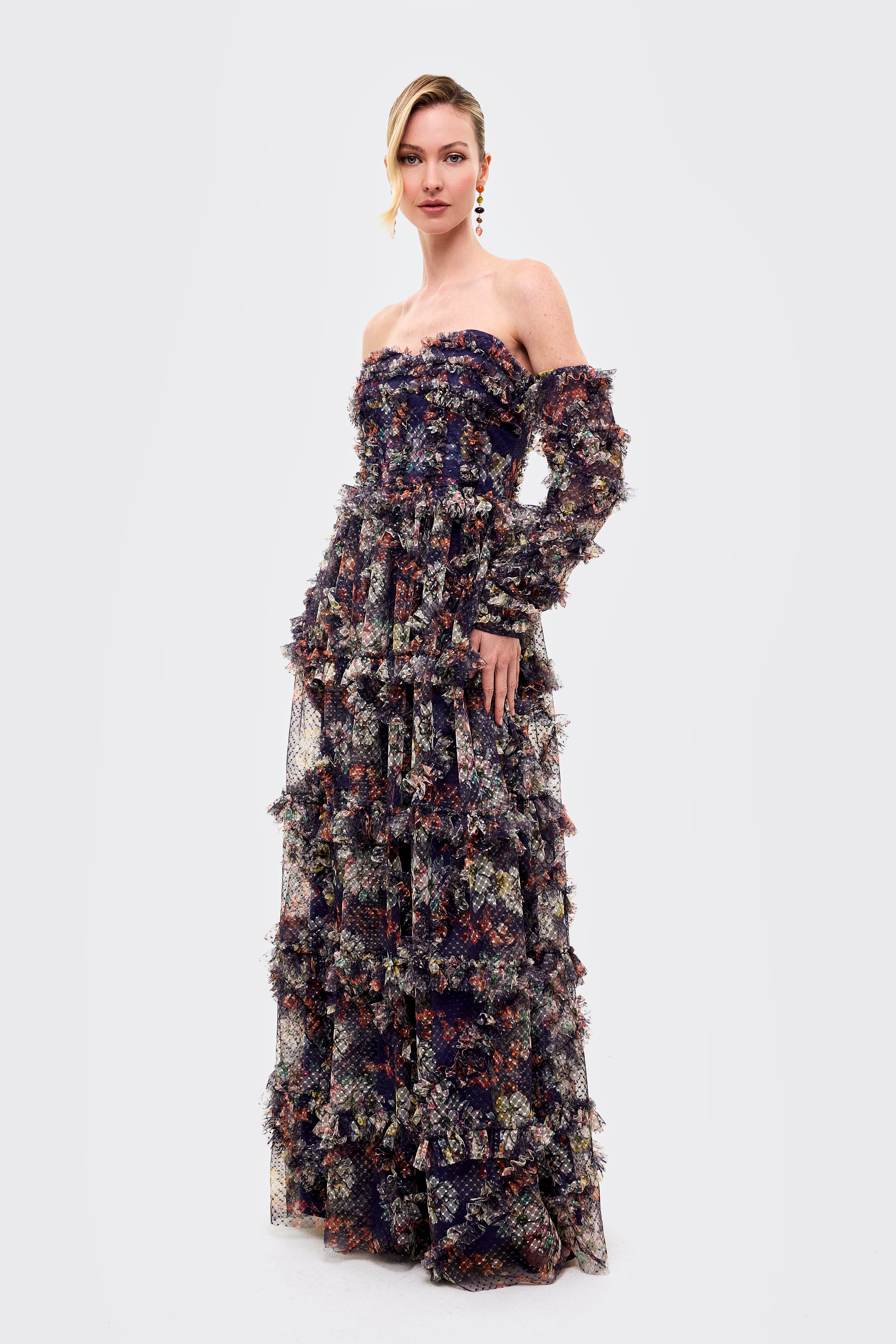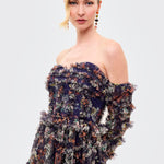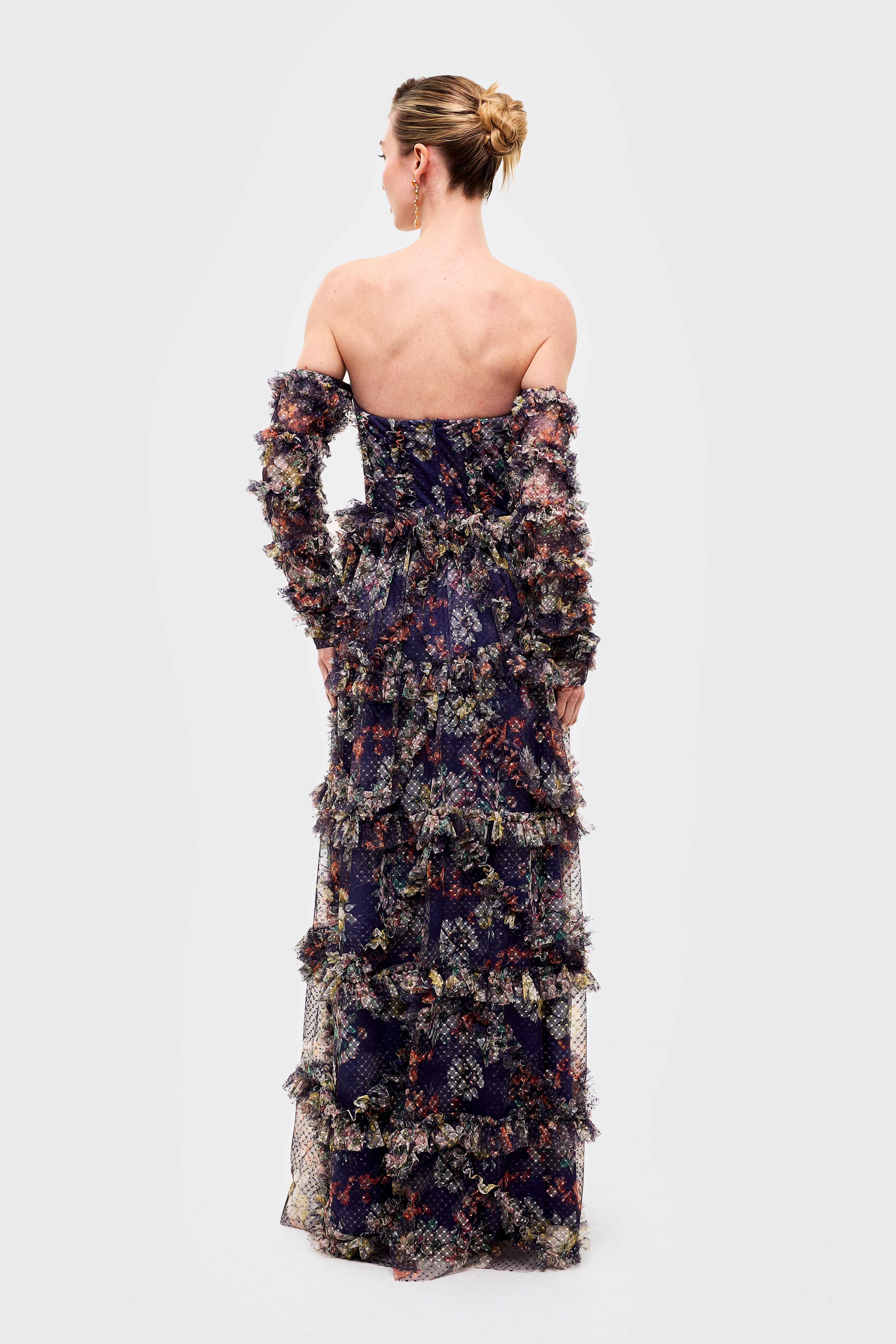 The dress includes detachable-style long sheer sleeves adorned with layered ruffles, creating a bold and couture-inspired look. From the waist down, the gown flows into a multi-tiered floor-length skirt with voluminous ruffle layers, enhancing movement and visual depth. The rich navy base with multicolor floral prints adds a sophisticated yet artistic touch, making this gown perfect for fashion events, evening parties, and statement occasions