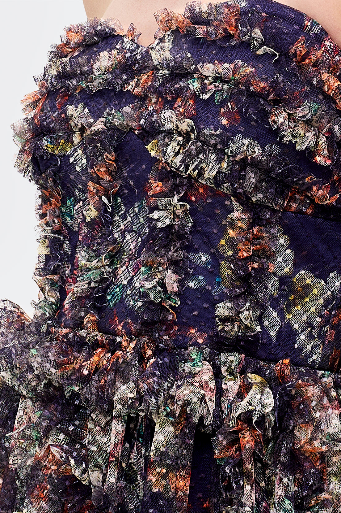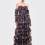 This dramatic navy floral tiered evening gown features a romantic off-shoulder neckline that elegantly highlights the shoulders and collarbone. The fitted bodice is crafted in delicate floral printed mesh fabric with soft ruffle detailing that adds texture and dimension to the upper silhouette.