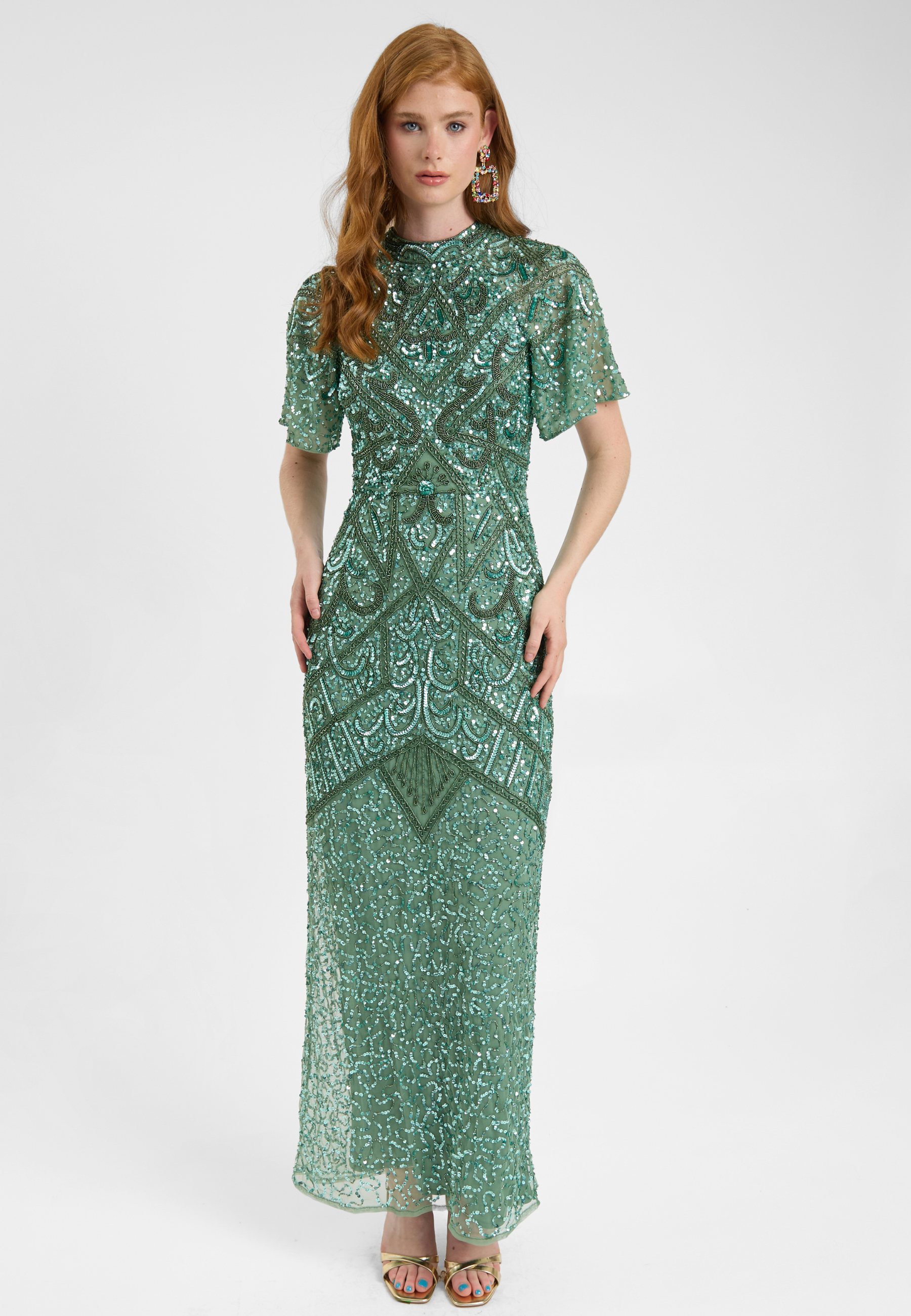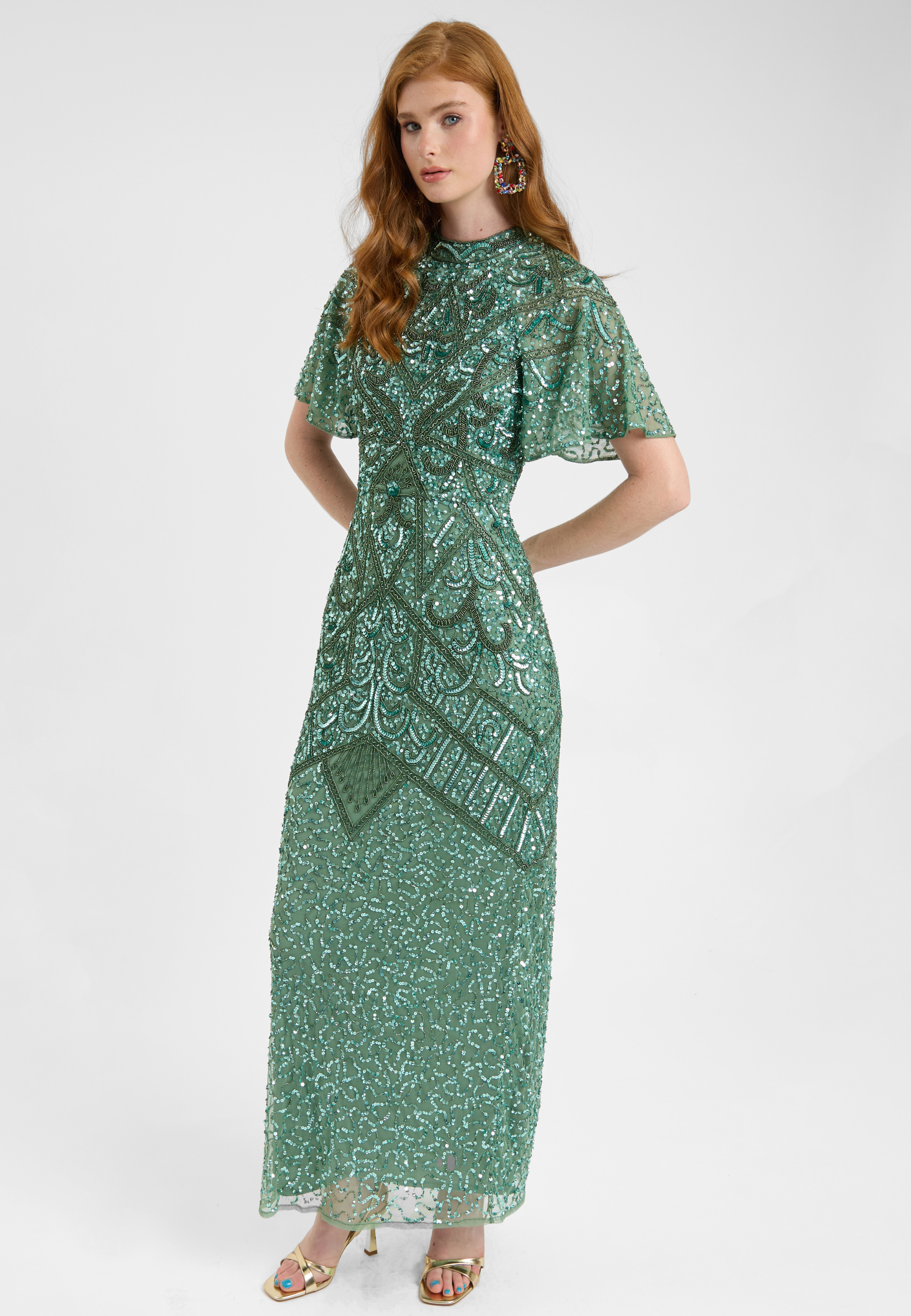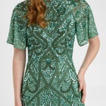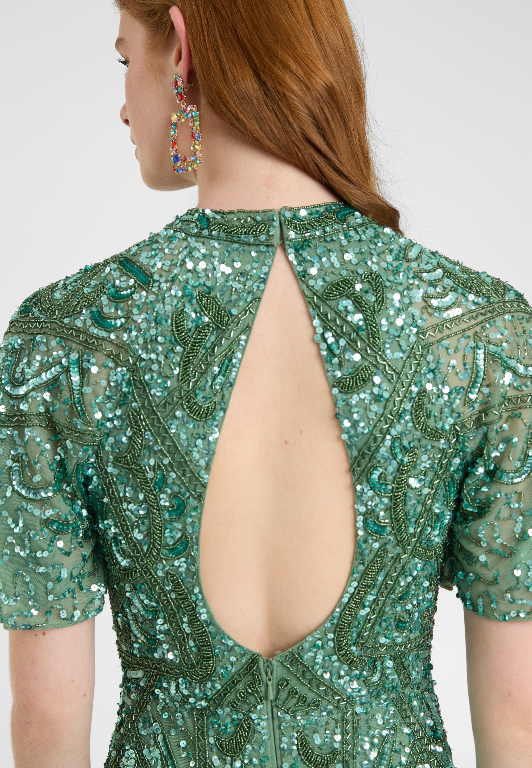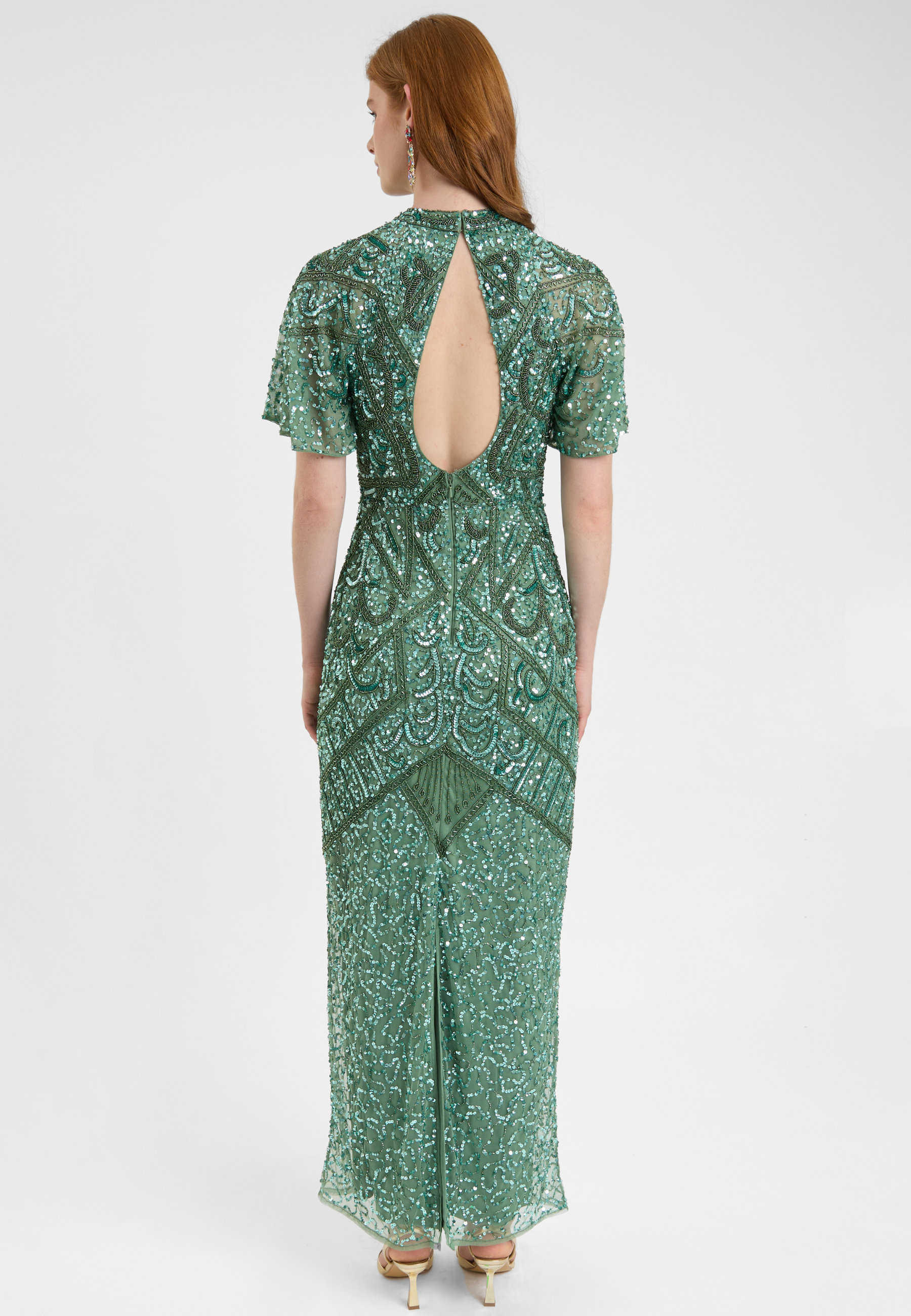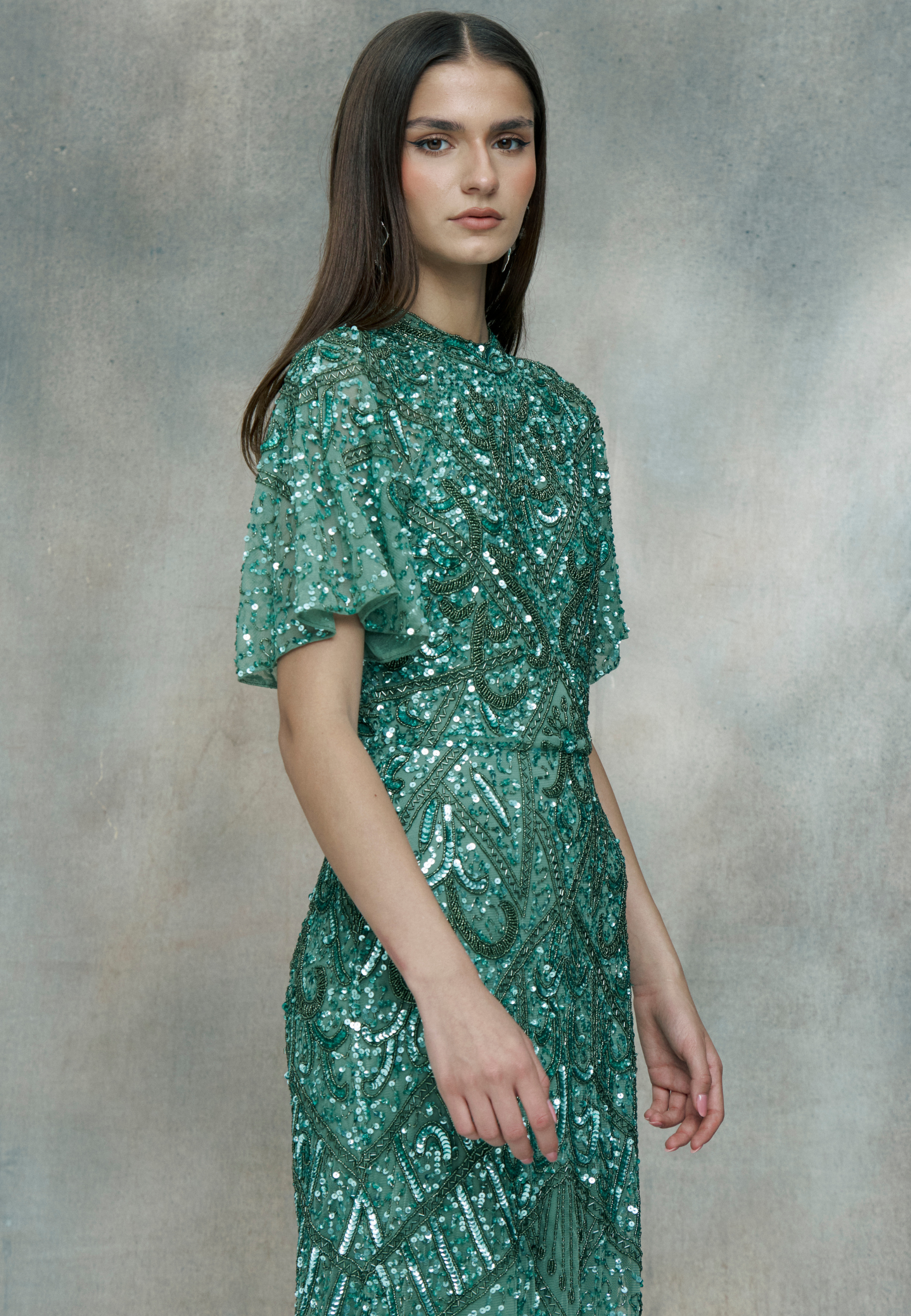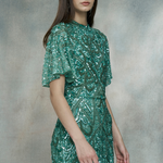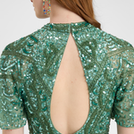 Woman wearing a green sequin dress, designed by BEAUUT