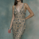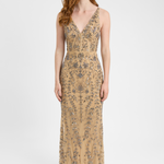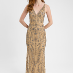 Step into refined elegance with this Champagne Gold Embellished V-Neck Evening Gown, a masterpiece of luxury and sophistication. Designed for those who adore timeless glamour, this gown features a deep V-neckline and delicate shoulder straps that beautifully frame the neckline and shoulders.