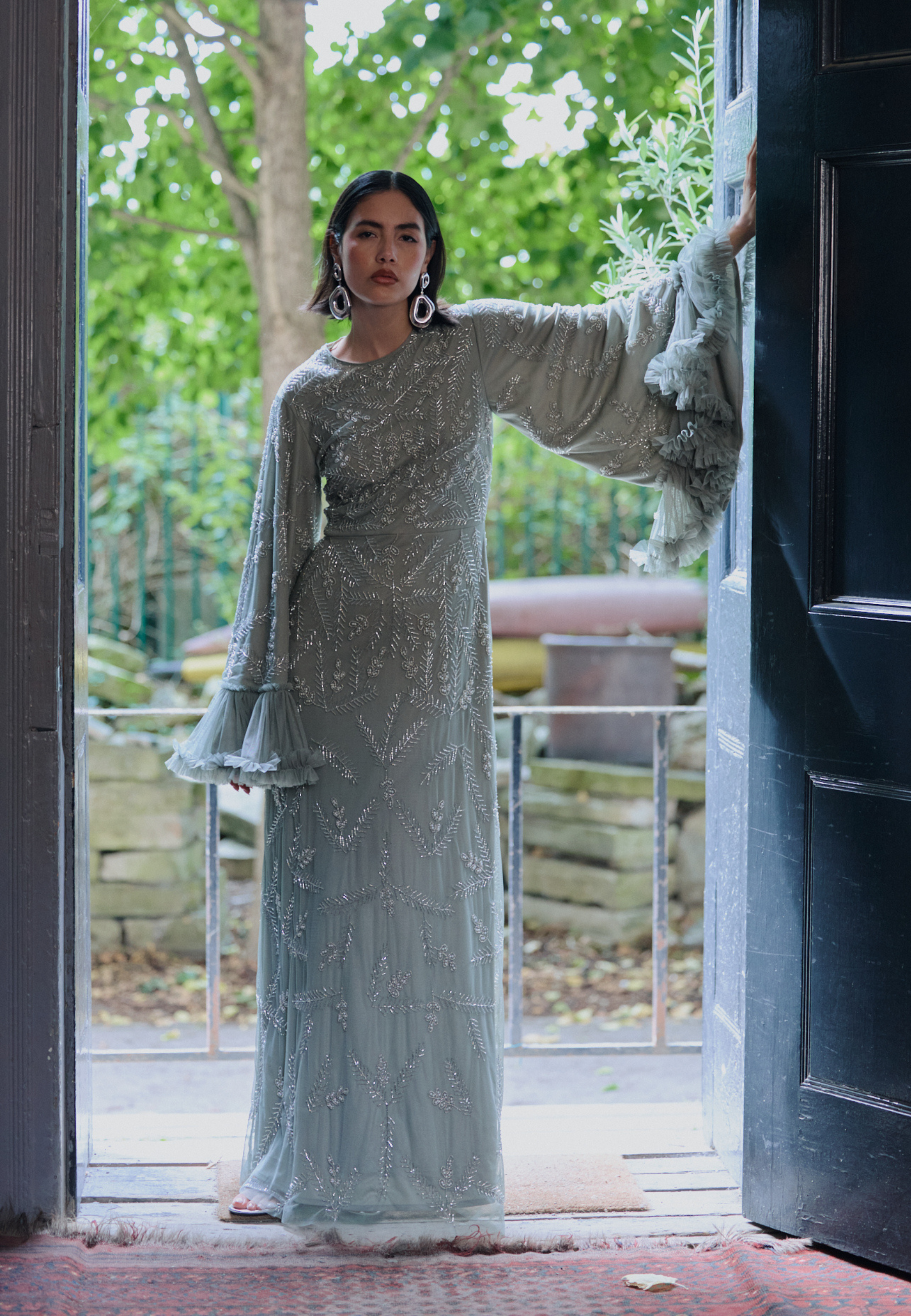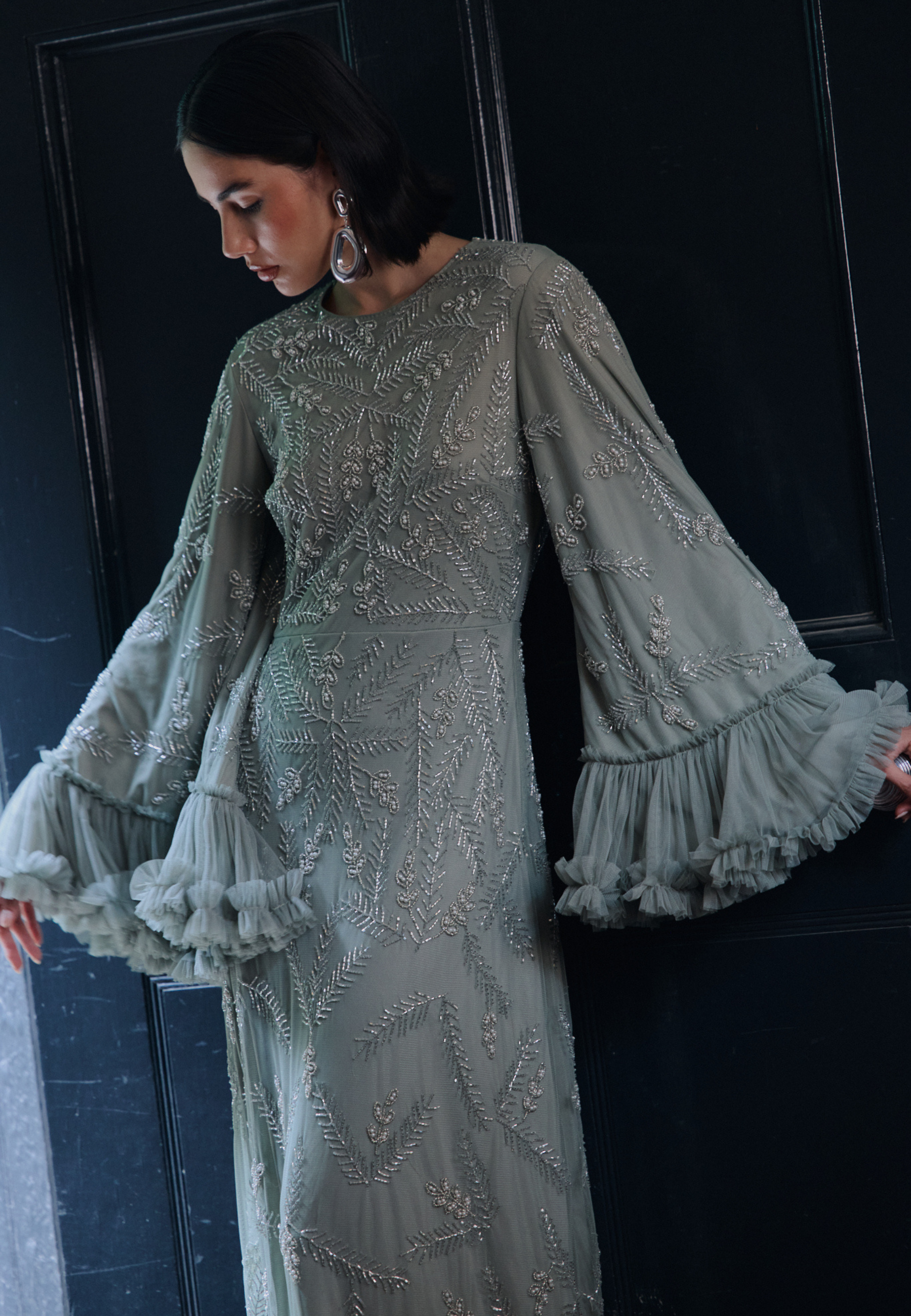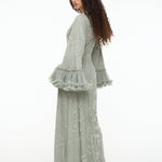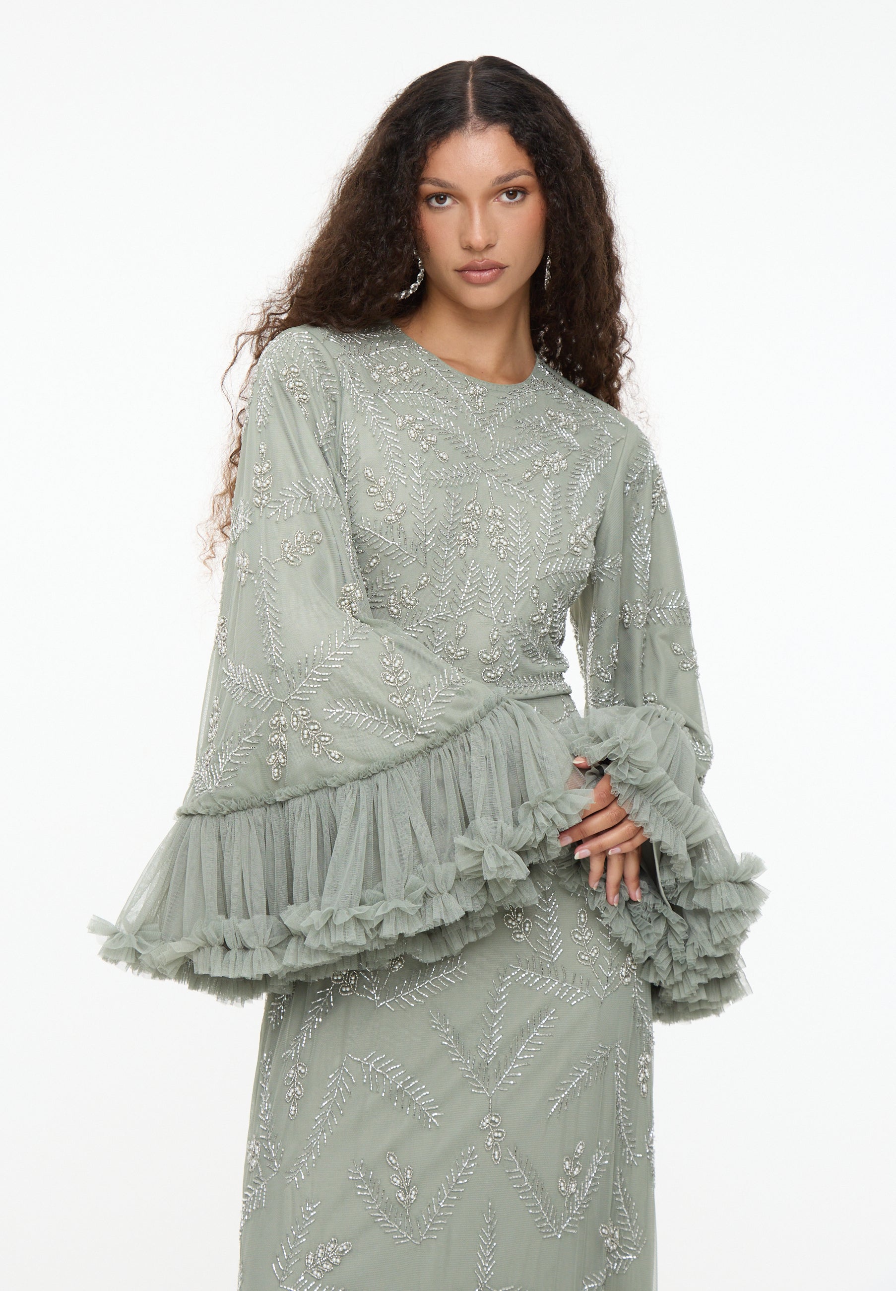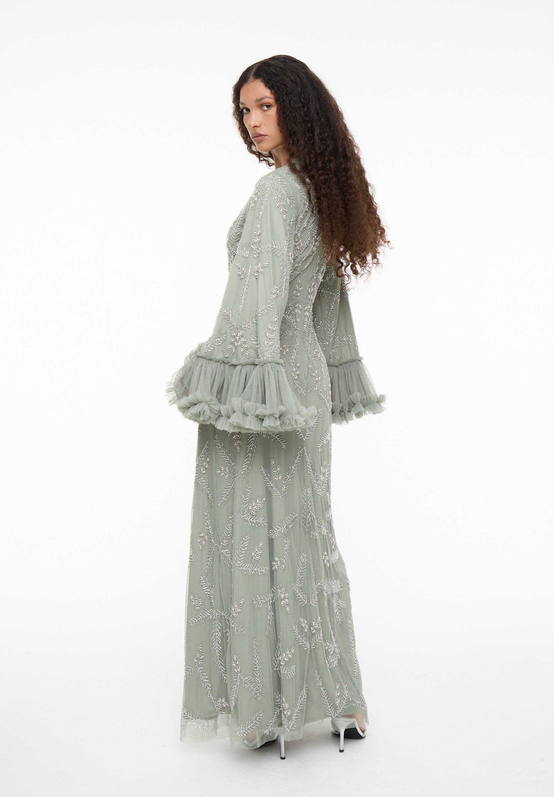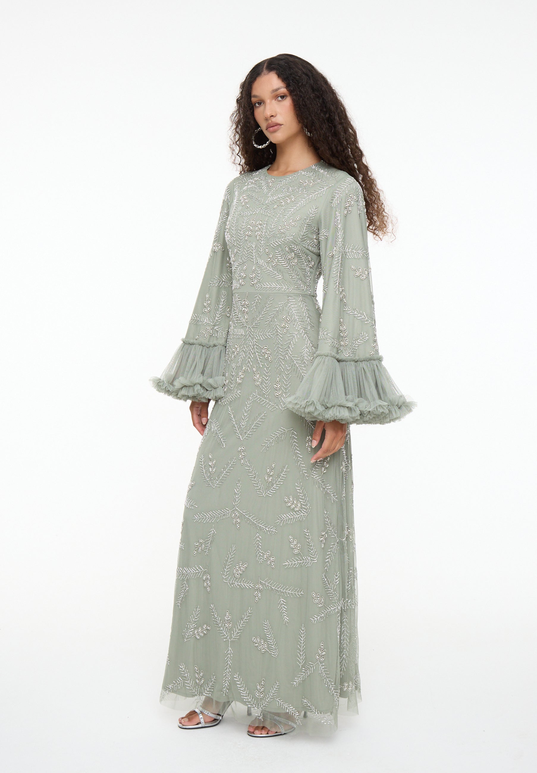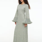 Shine effortlessly in the Malia Sage Green Sequin Maxi Dress by MARYISA. Flowing chiffon, a modest high neckline, and full-length sleeves create graceful elegance, while subtle sequins add sparkle. Perfect for weddings, evening events, or special occasions, it pairs beautifully with metallic heels and minimal accessories.