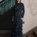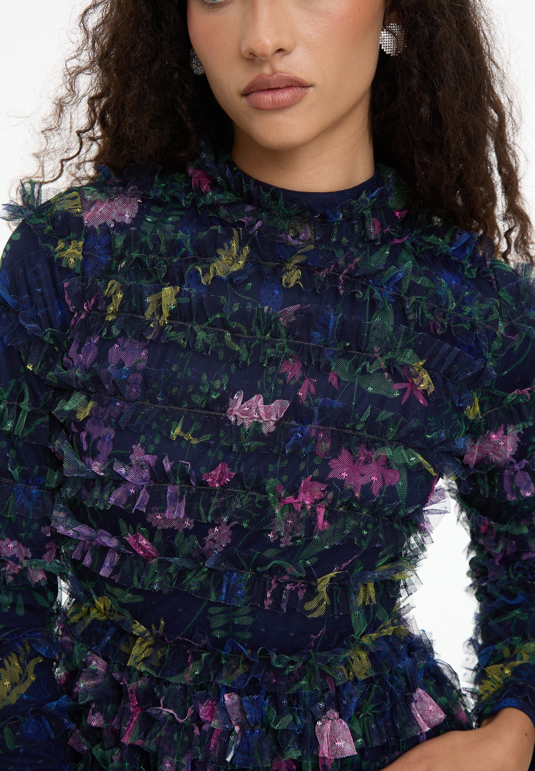 1. Elegant Design: Delicate ruffles and a soft multicolor pattern give this dress a refined and classy look.
