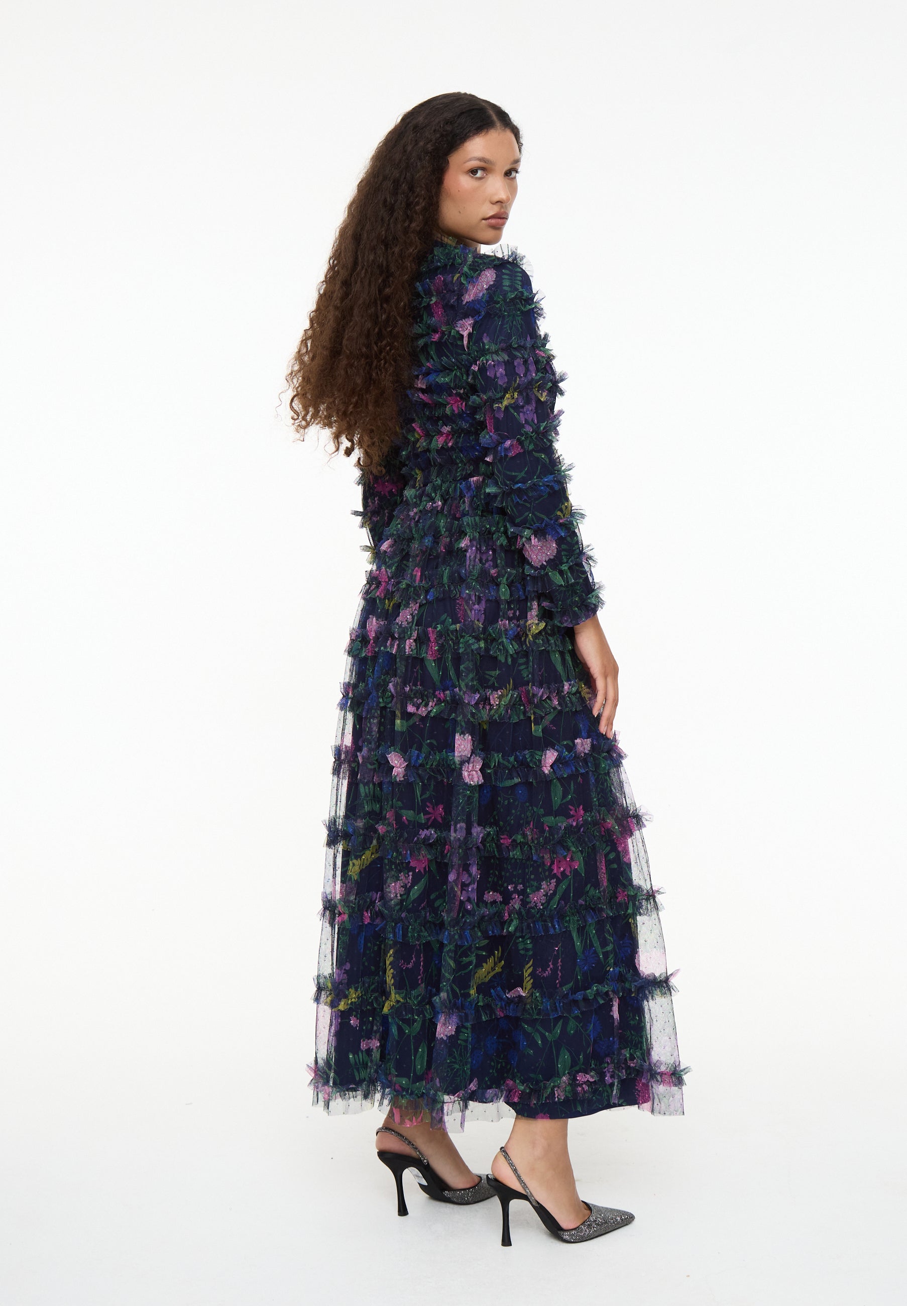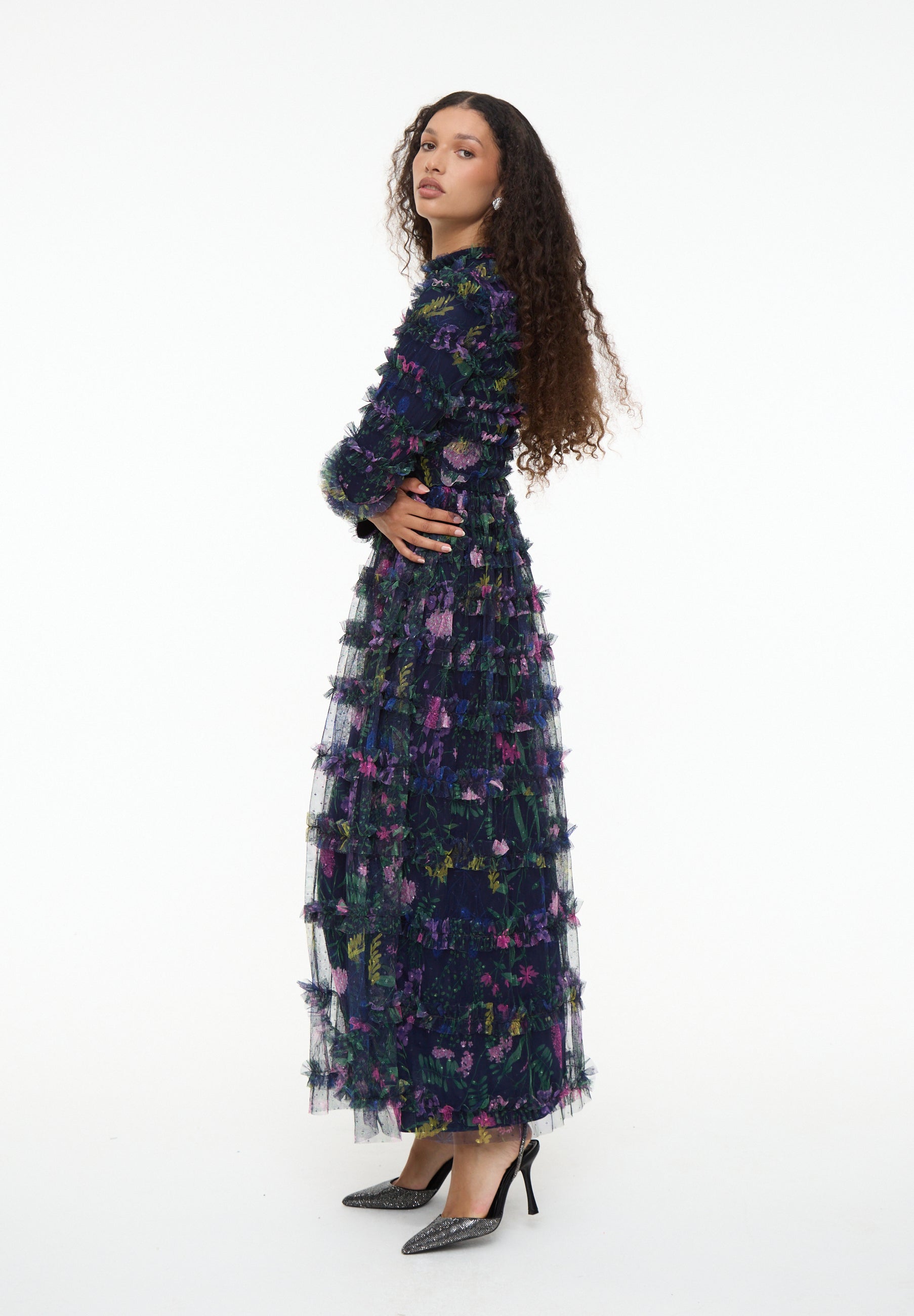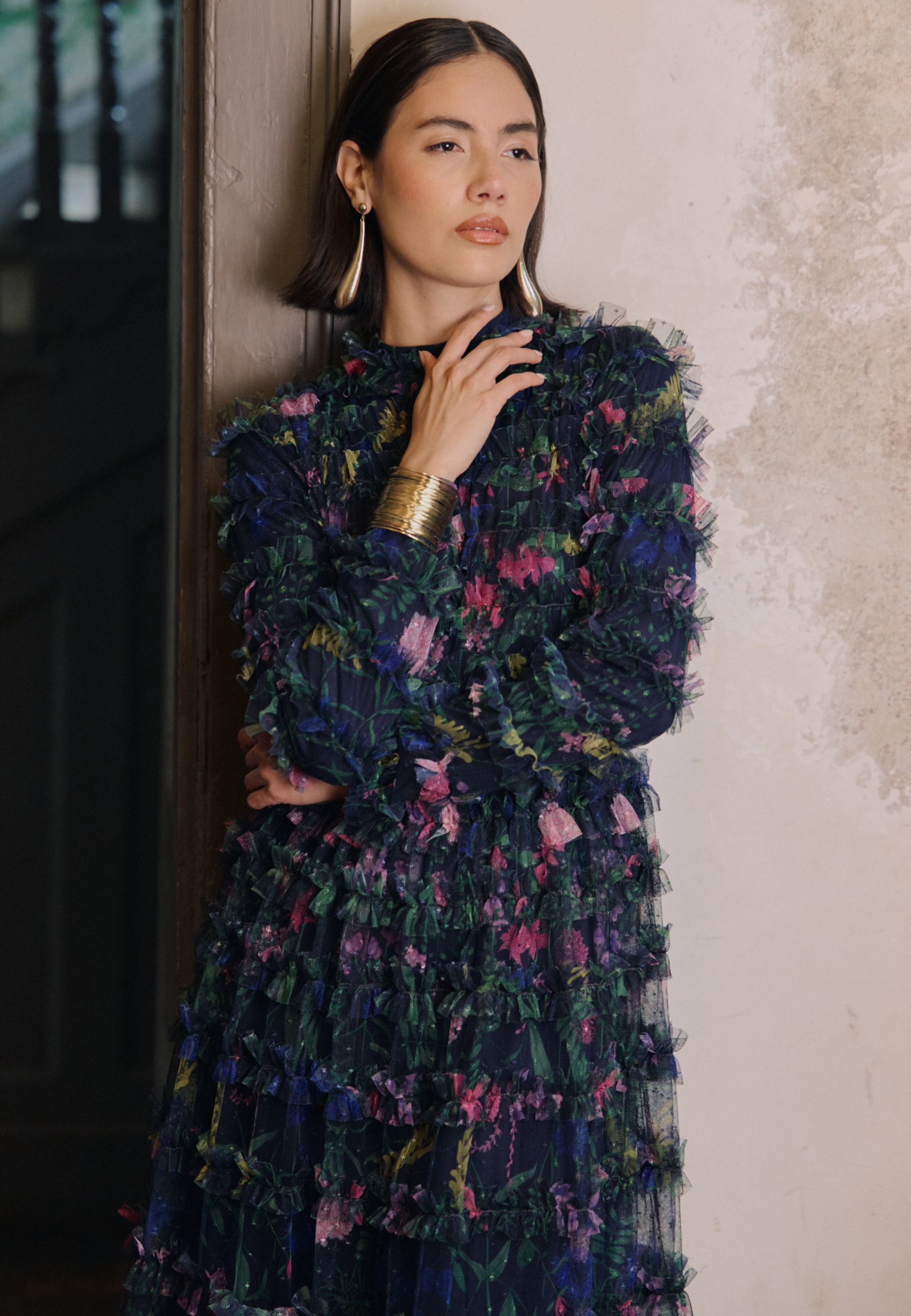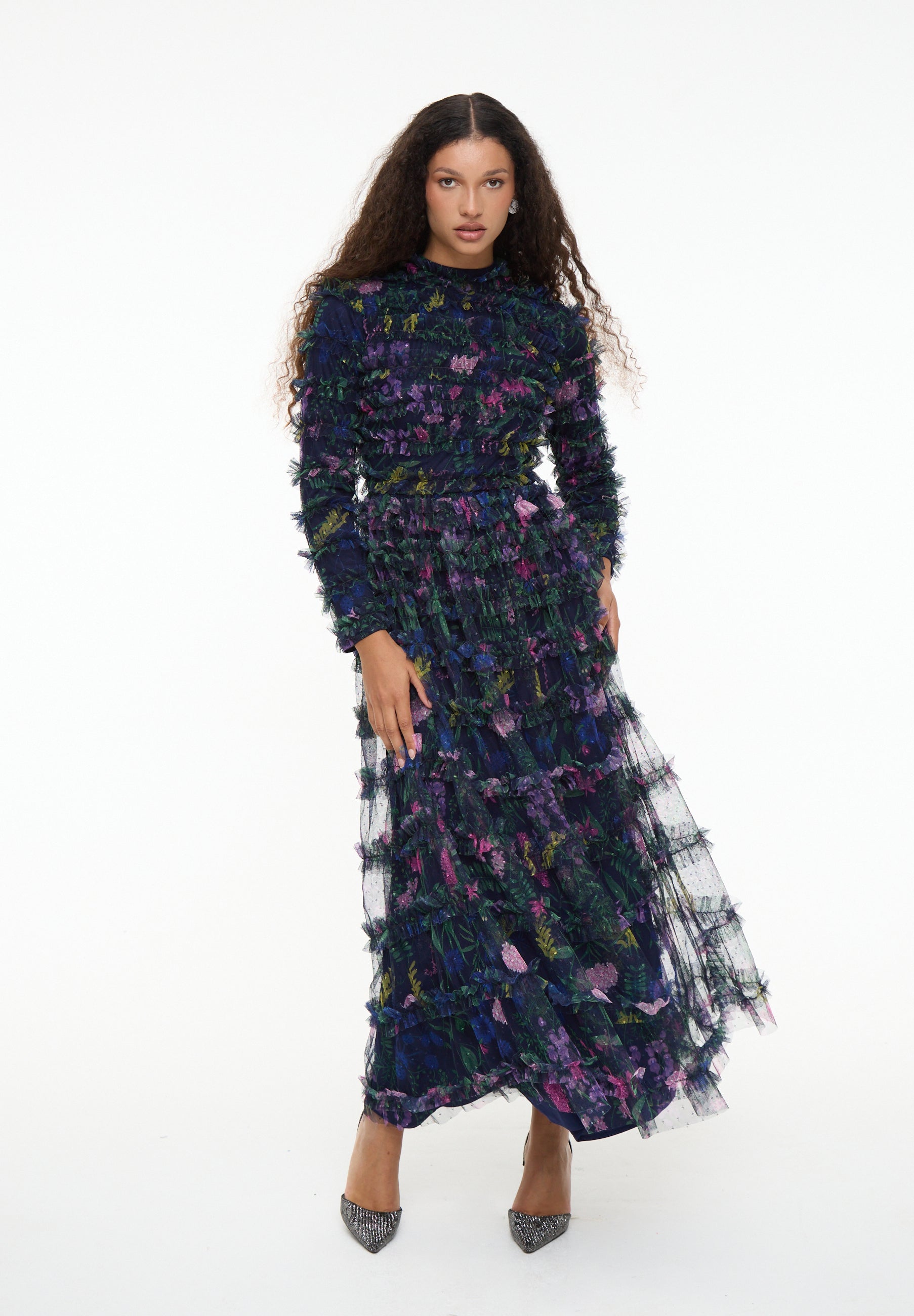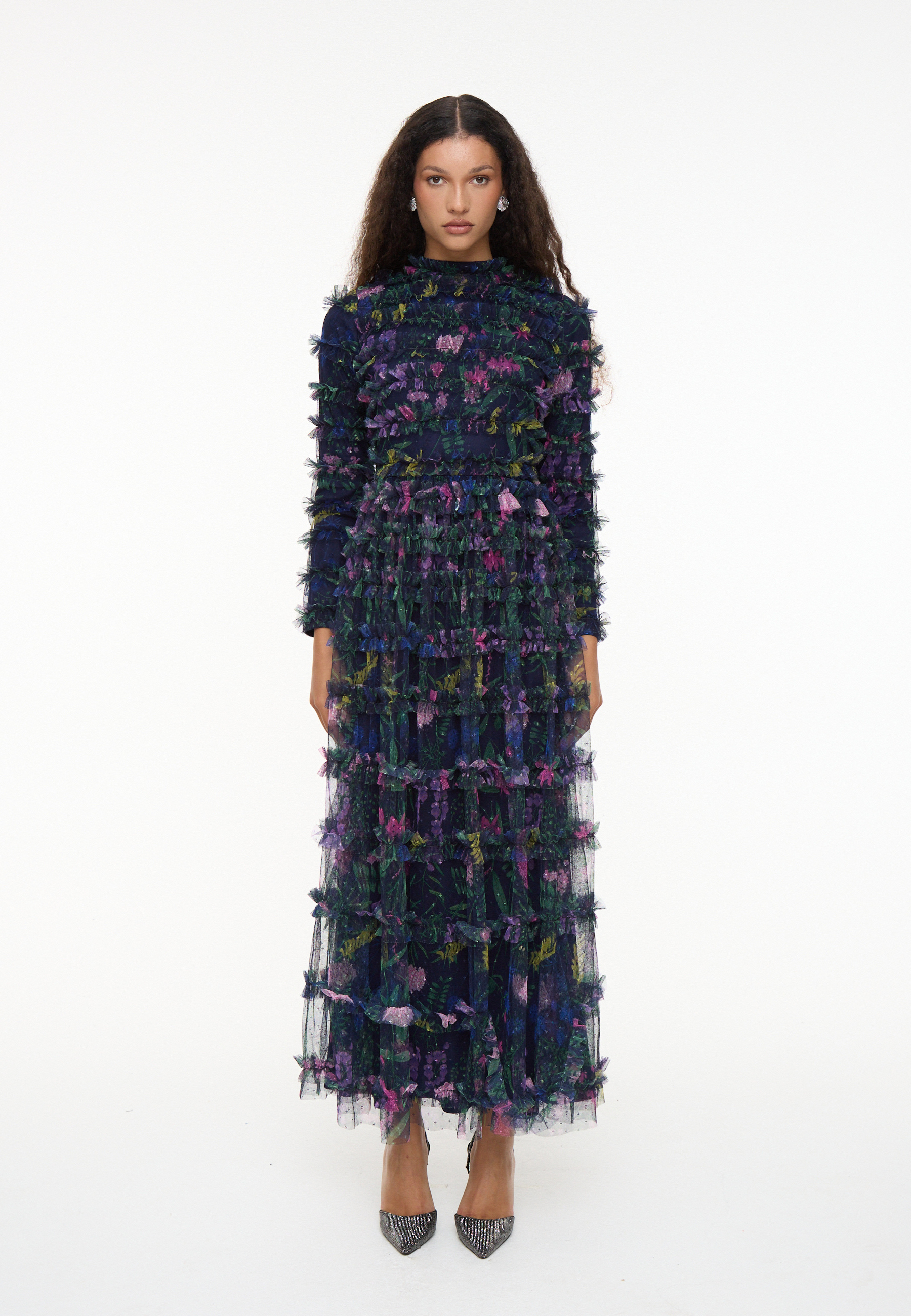 Presented by MARYISA, the Miray Modest Ruffle Maxi Dress is a sophisticated and graceful choice, perfect for special occasions. Featuring delicate ruffle details and a subtle multicolor pattern, this dress exudes charm and elegance.