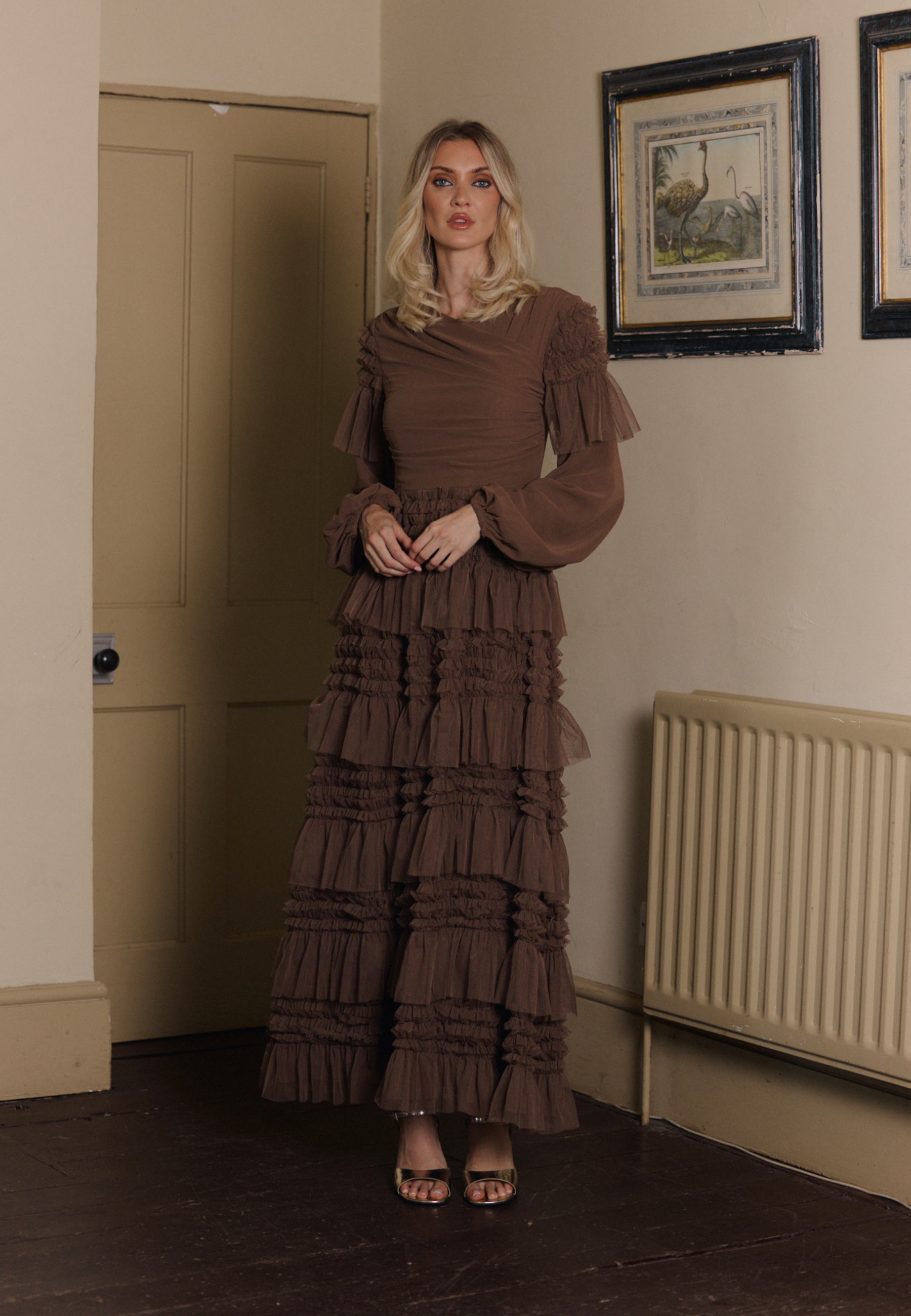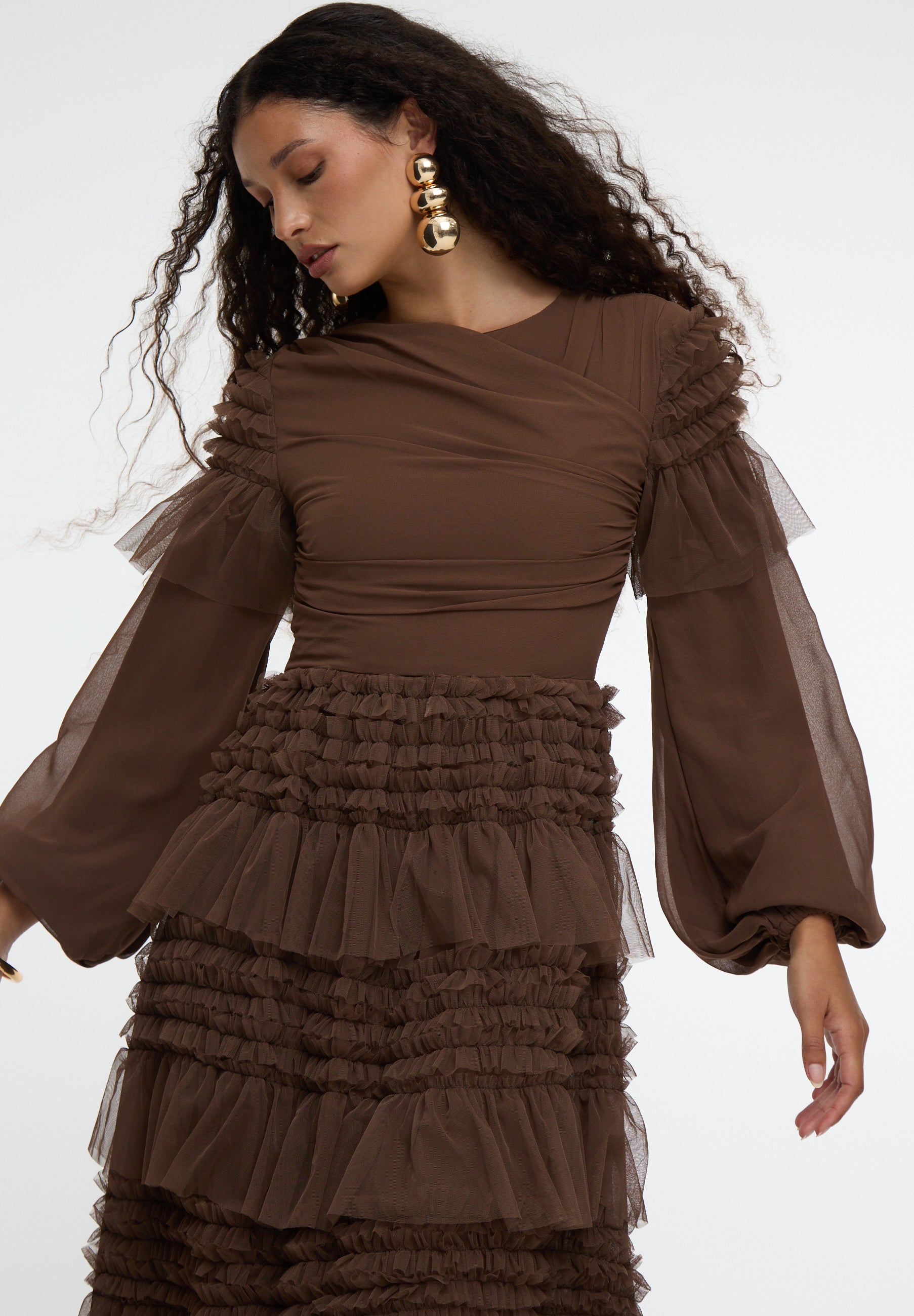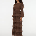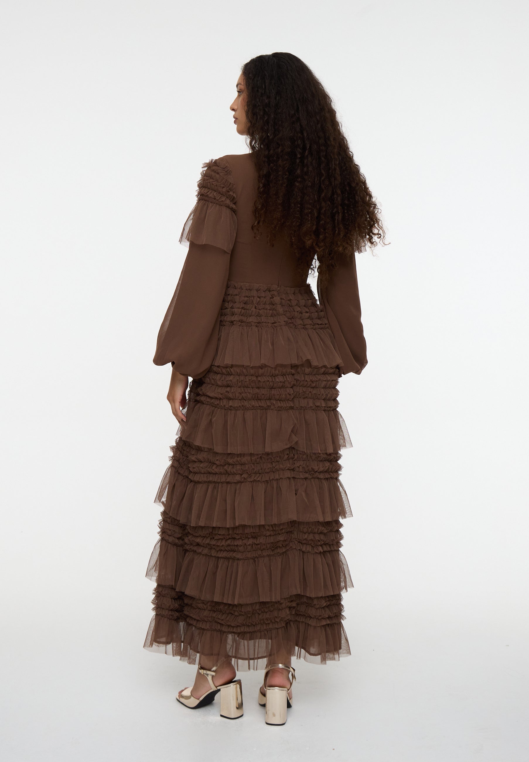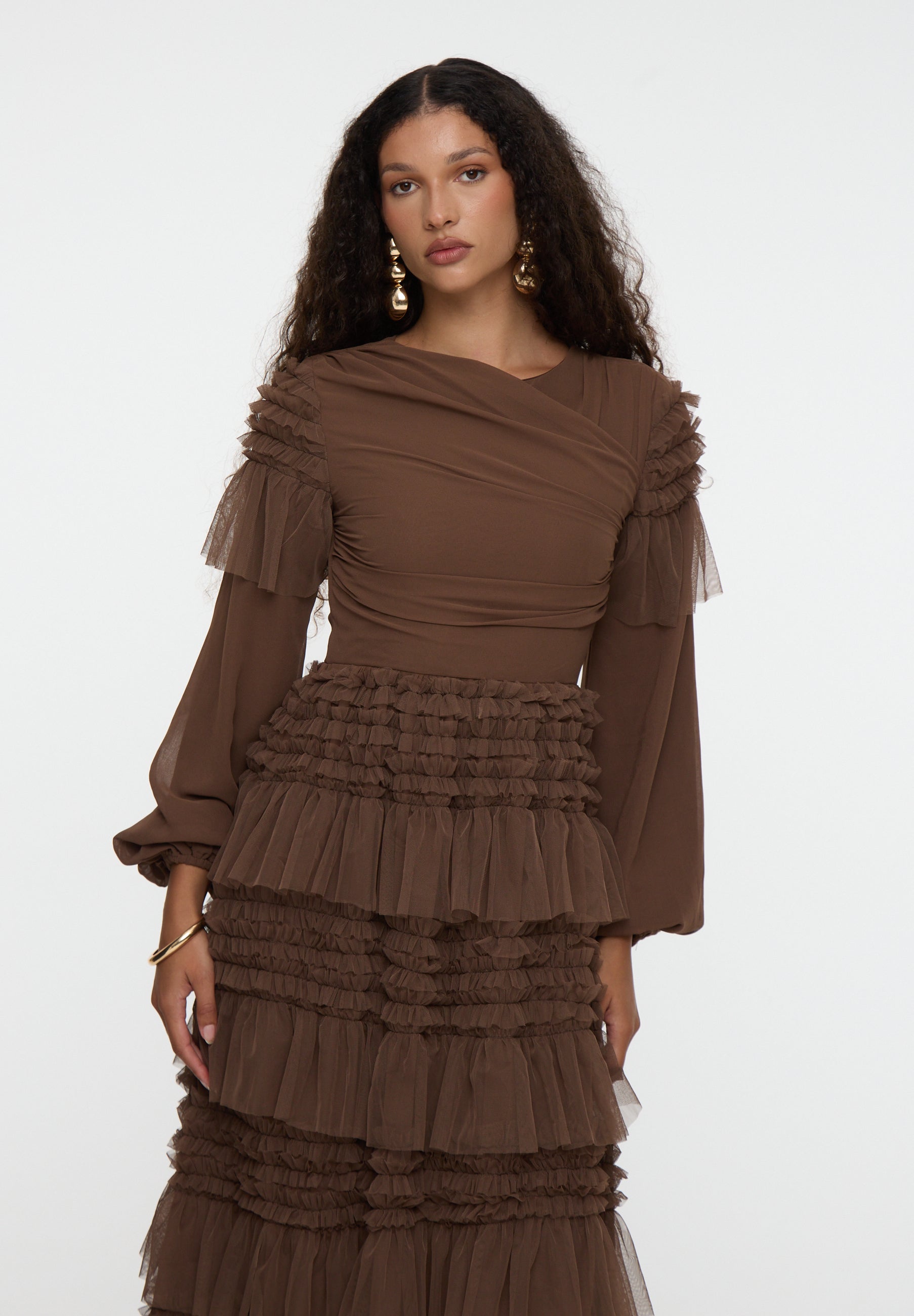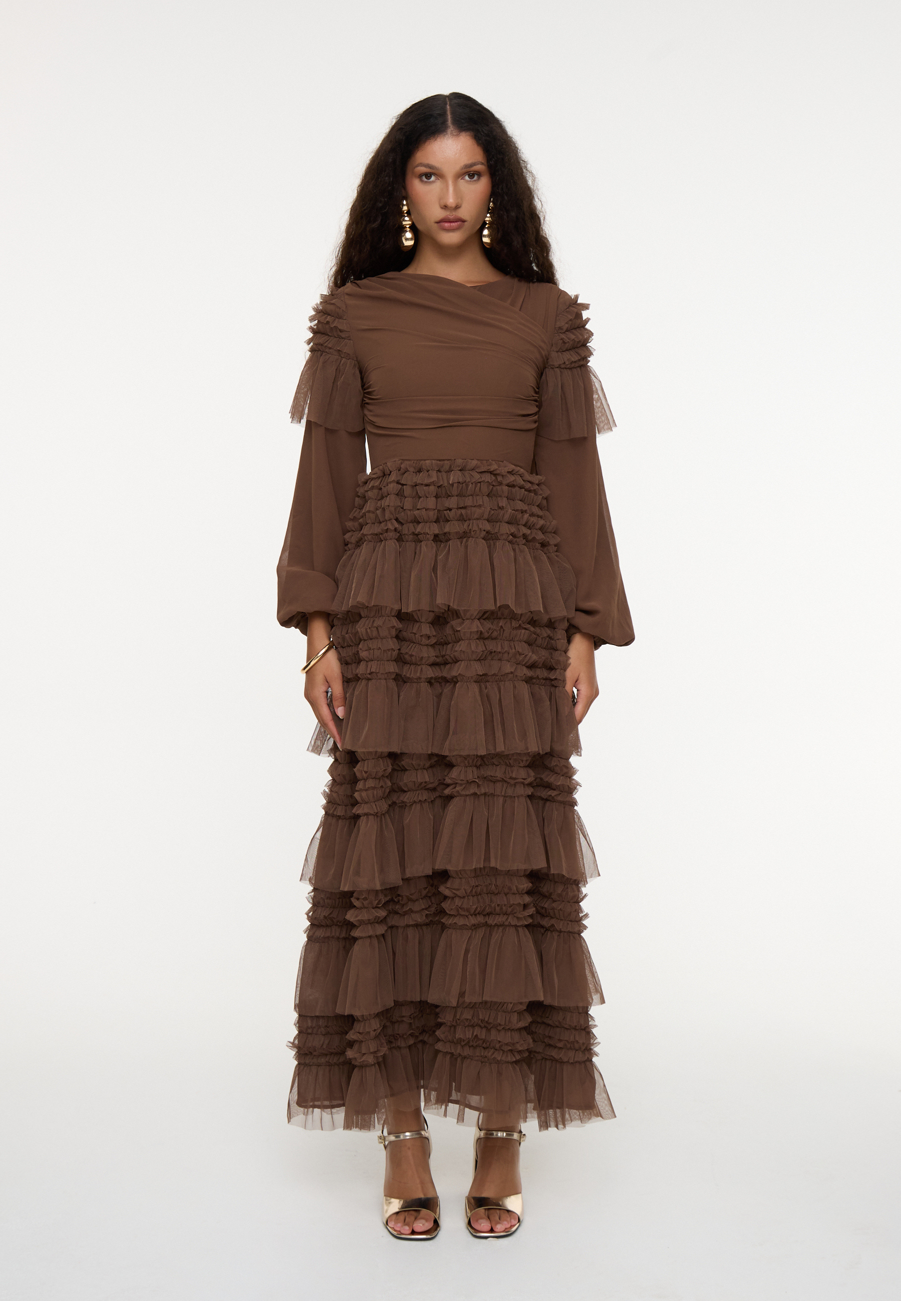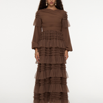 The Naia Chocolate Chiffon Maxi Dress isn’t just a dress—it’s an experience of style, comfort, and timeless elegance. Soft chiffon gracefully drapes over the body, creating a gentle silhouette that moves effortlessly. The high neckline and full-length sleeves provide refined modesty, while delicate details add subtle charm without overpowering the design.