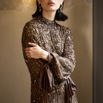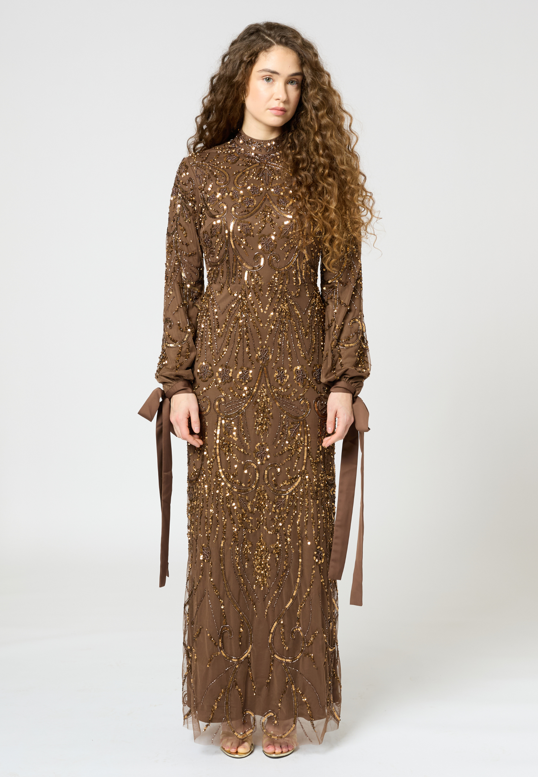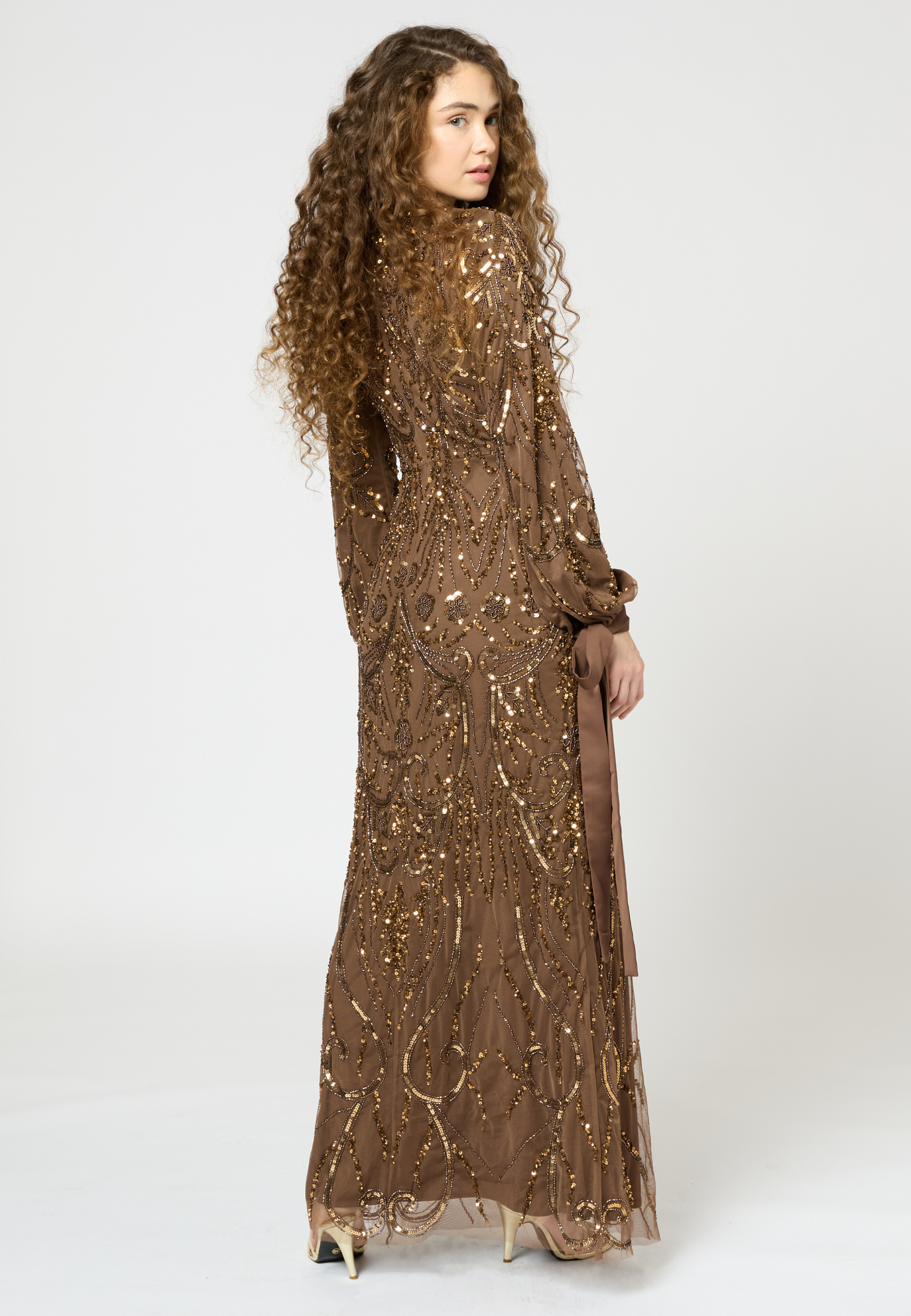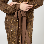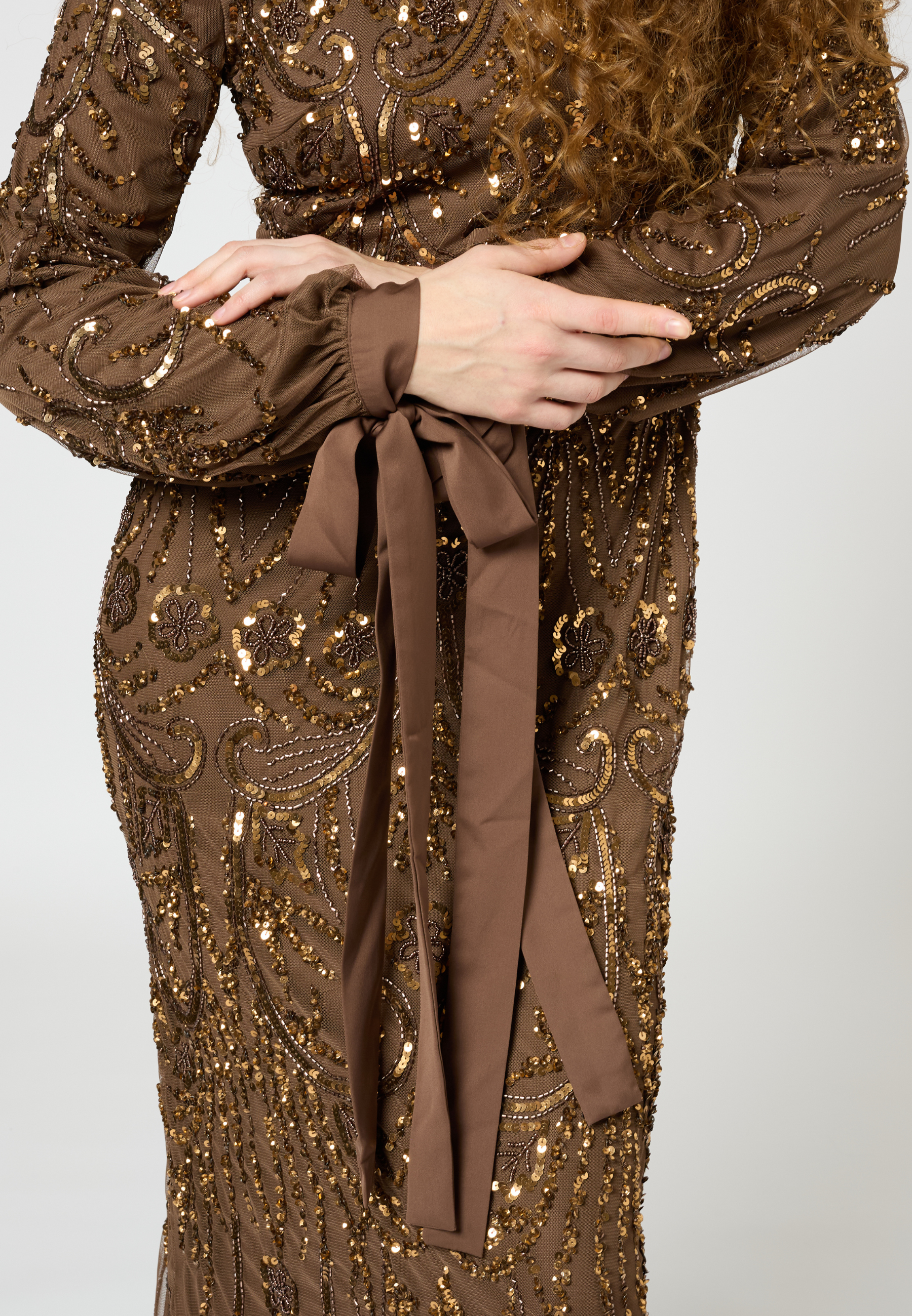 This rich chocolate dress sparkles beautifully with sequin detailing that catches the light in every direction. Its modest cut offers a sophisticated silhouette, making it perfect for a formal dinner or charity event.