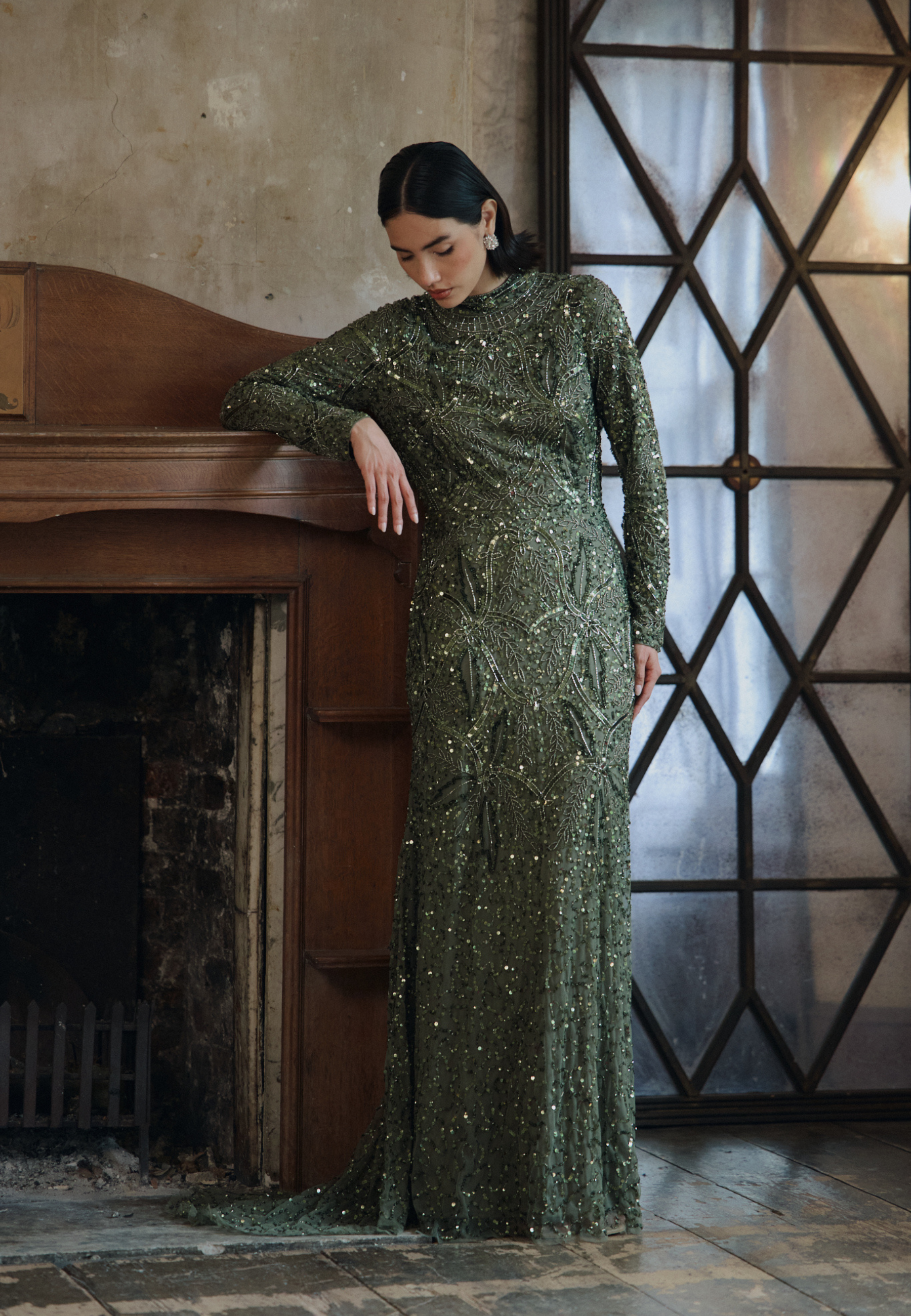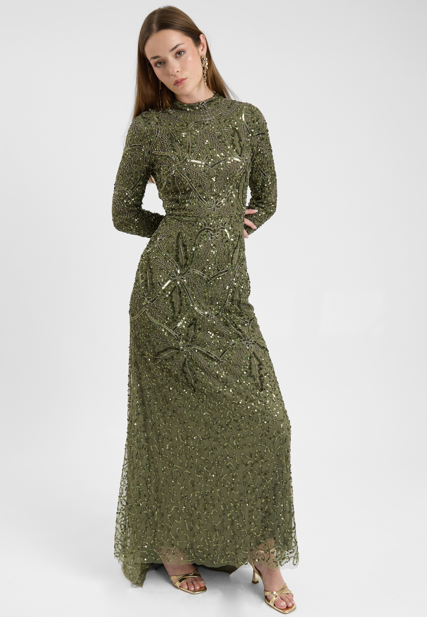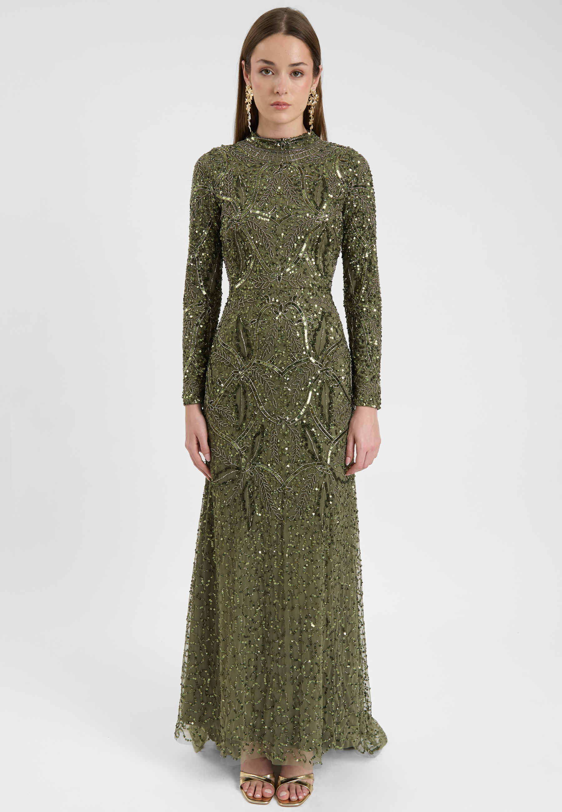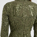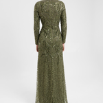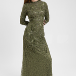 A soft emerald green hue meets intricate sequin detailing in this gorgeous dress, exuding femininity and grace. Whether at a spring wedding or a formal dinner, its sparkling beauty will captivate without compromising your modesty.
