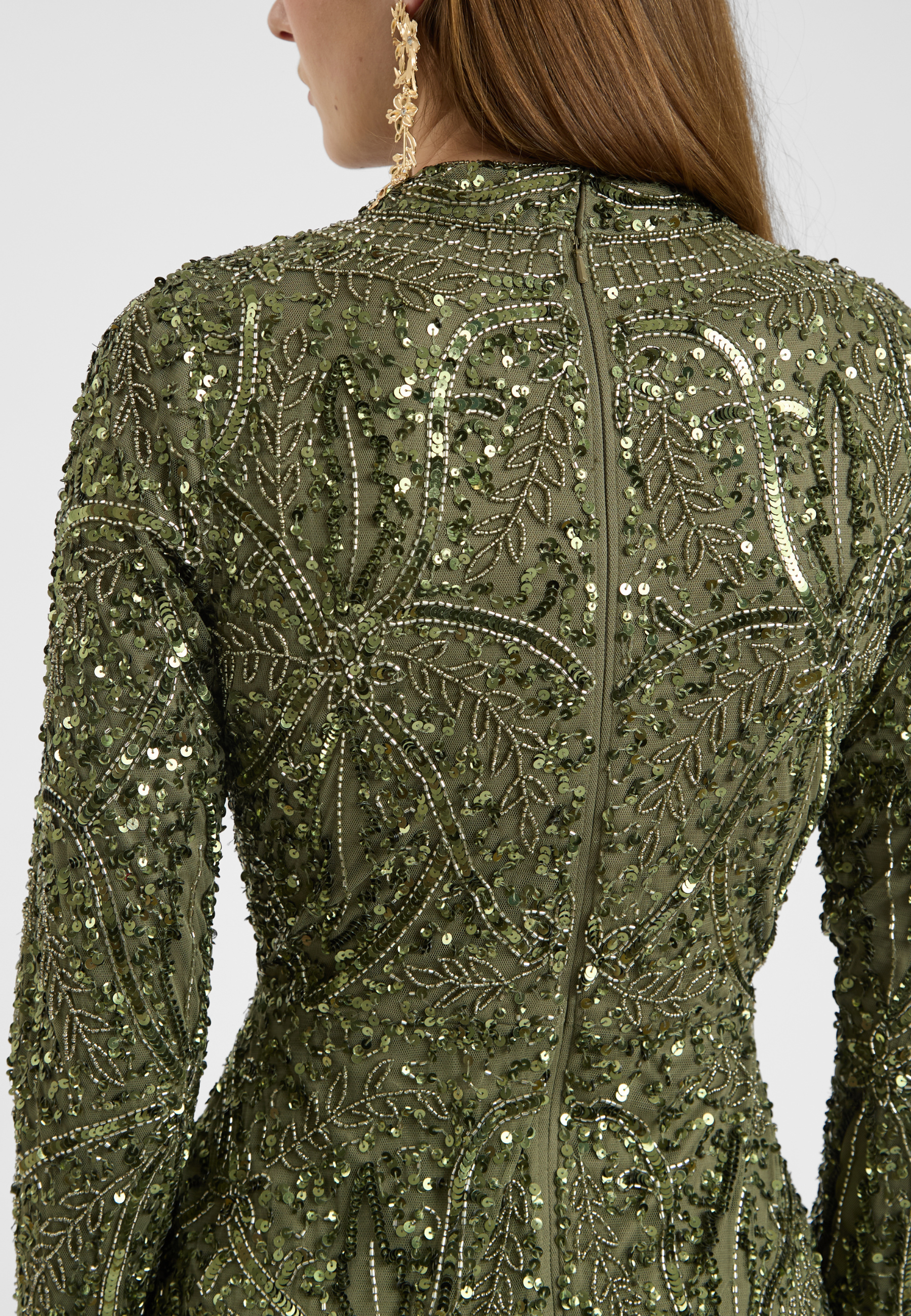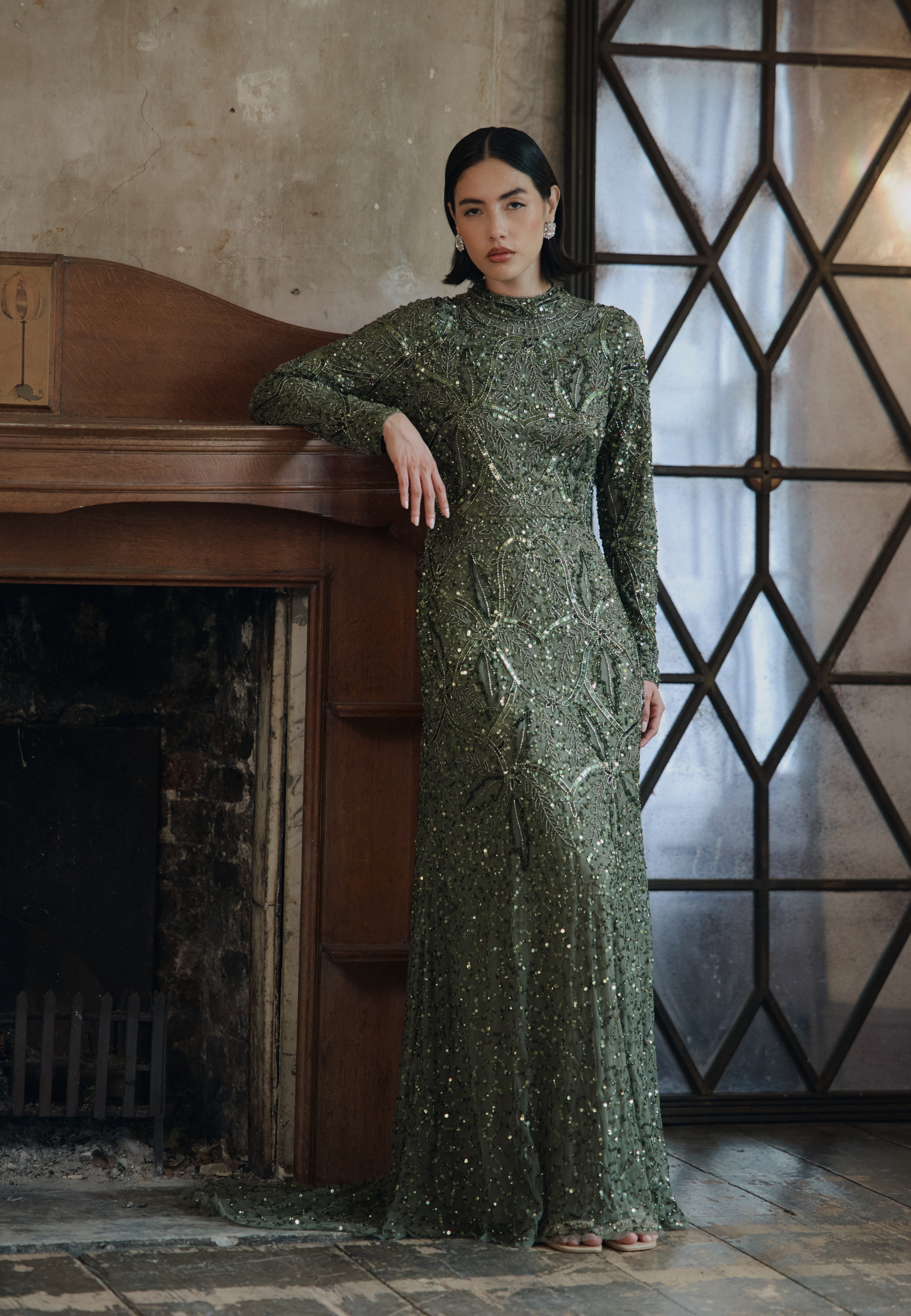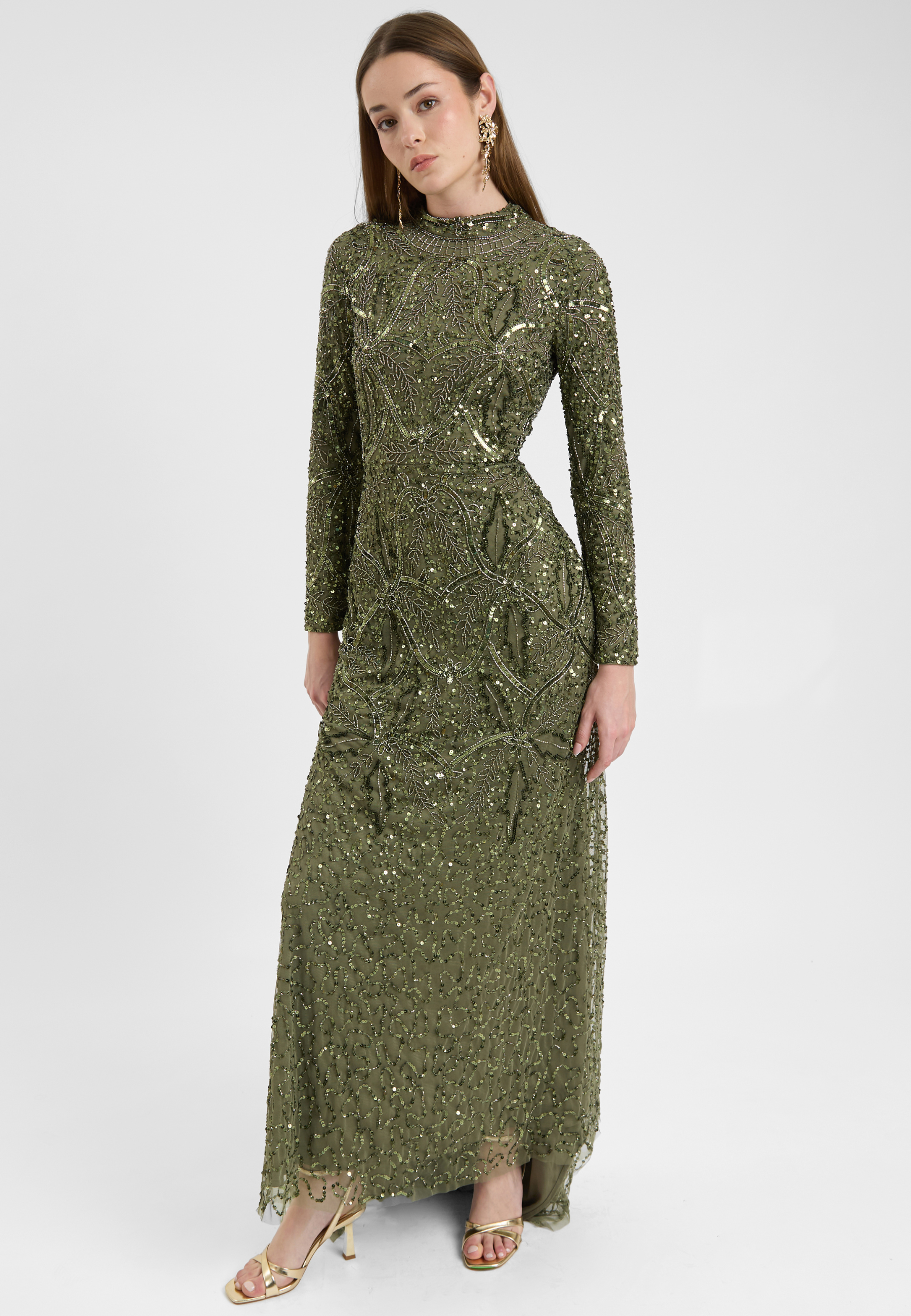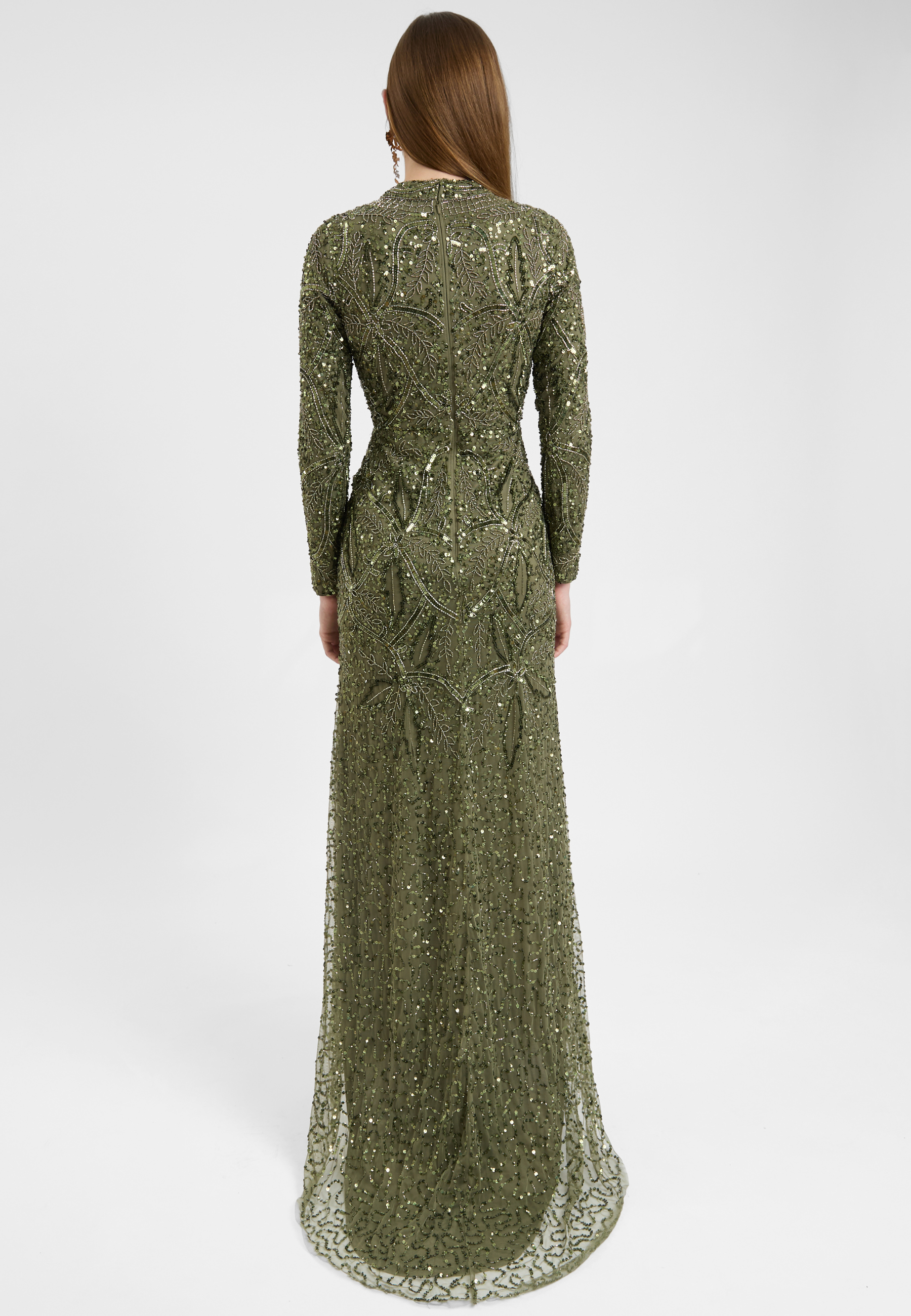 A soft emerald green hue meets intricate sequin detailing in this gorgeous dress, exuding femininity and grace. Whether at a spring wedding or a formal dinner, its sparkling beauty will captivate without compromising your modesty.