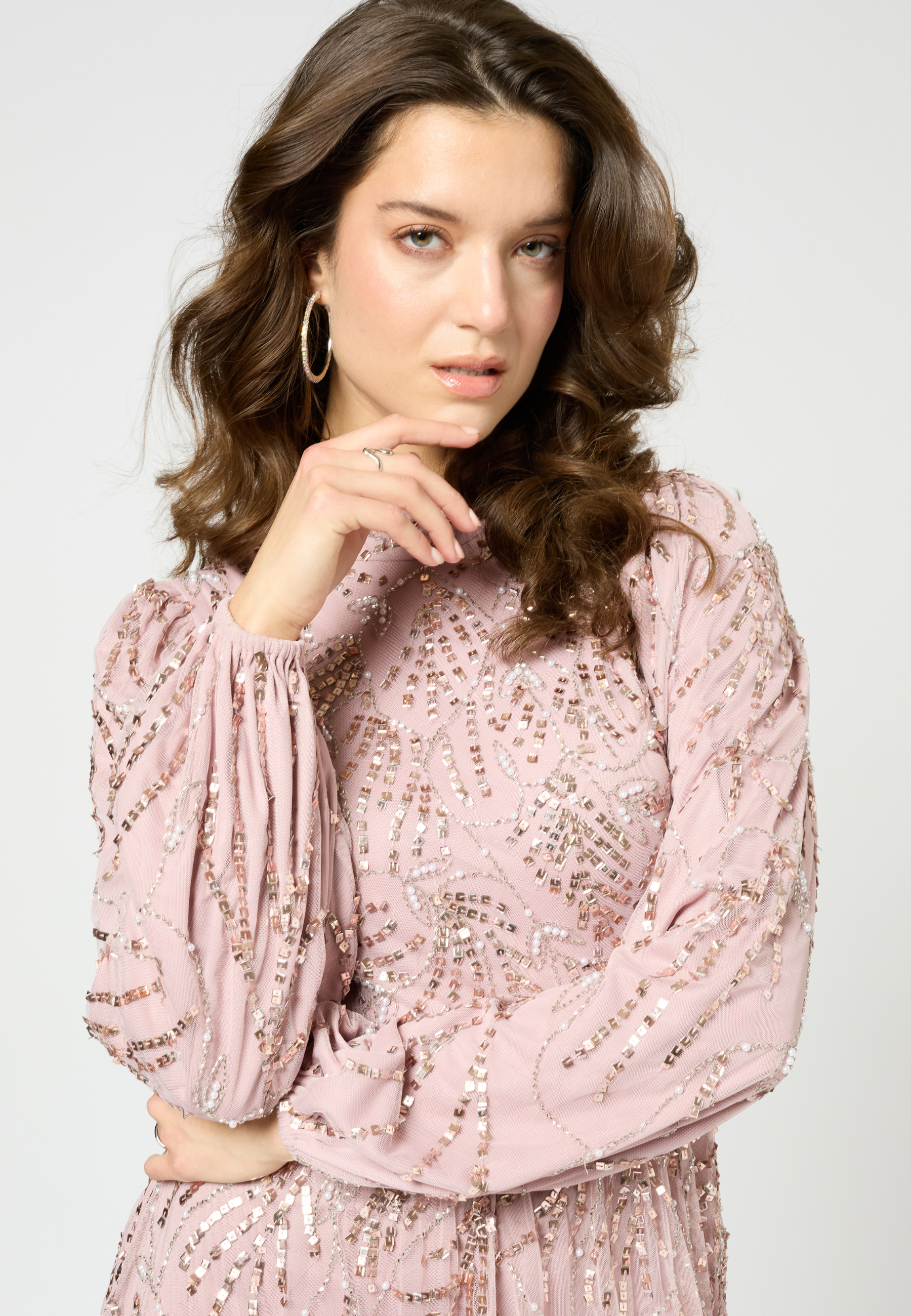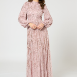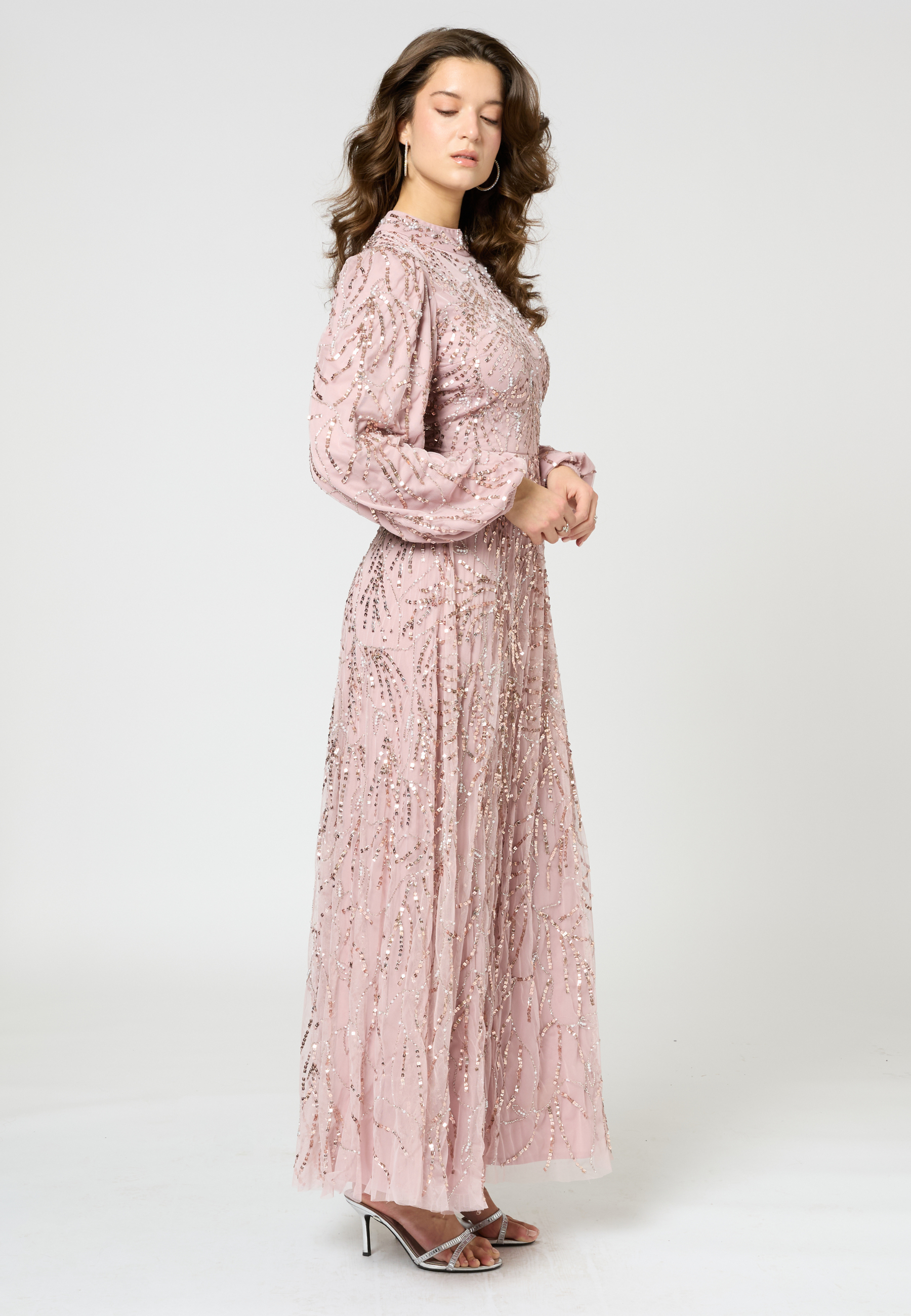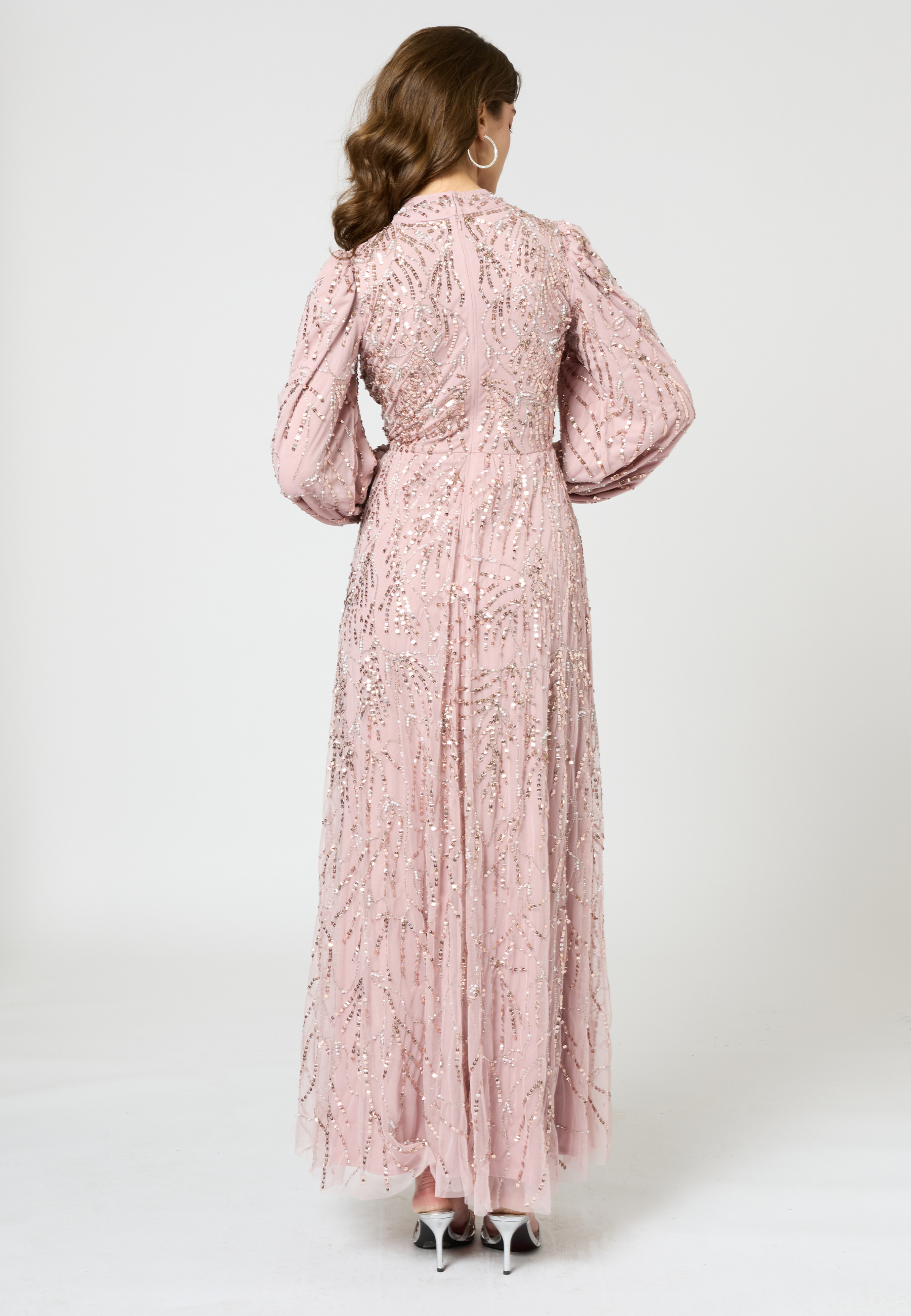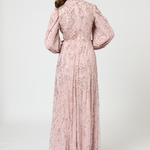 Gorgeous embellished maxi dress in frosted pink color from our collection SS 2025. The stunning hand embellishments and beading will have all eyes on you and you sparkle all night long. Perfect for Prom, a black tie event or any special evening occasion.